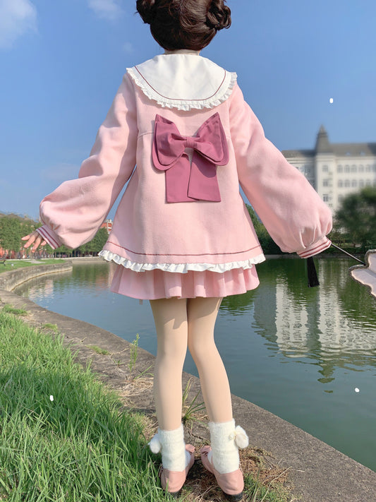 Lace Sailor Collar Lolita Black & Pink Winter Big Bow Woolen Coat Jacket