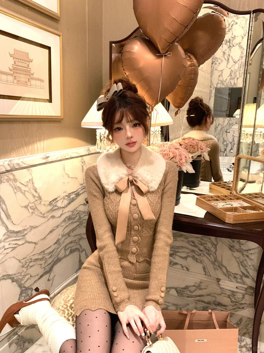 Lazy Girl Cheese Mousse Brown Cream Sweater & Skirt Fur Collar Two Piece Set