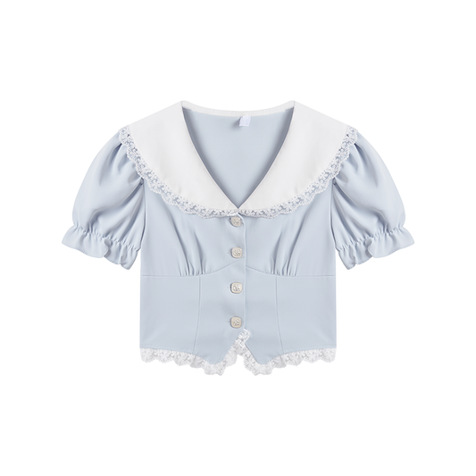 Lazy Girl Coquette Blue Puff Sleeve Shirt Blouse & Ruffled White Mini Skirt Two Piece Set