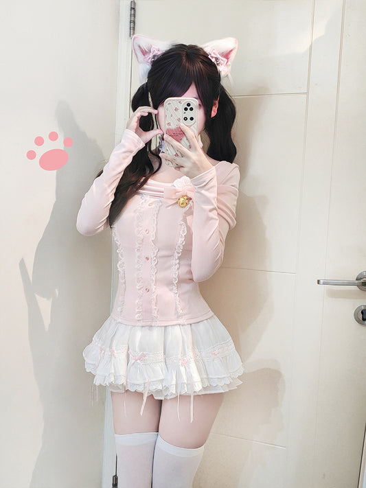 Sweetheart Cat Pink Top & White Skirt Two Piece Set
