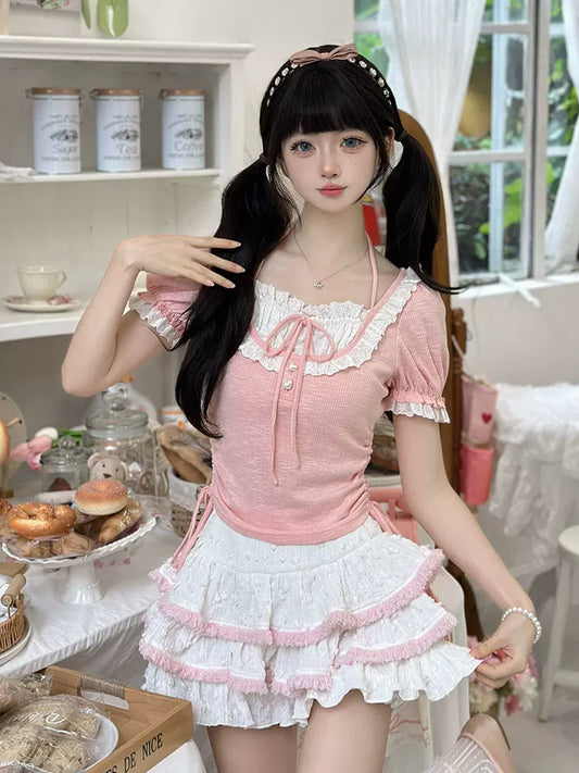 Candy Fairy Sweet White Camisole Top & Blue Ruffle Skirt Two Piece Set