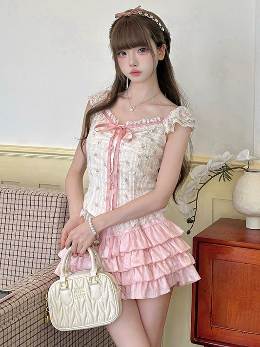 Summer Flower White Top & Pink Skirt Two Piece Set