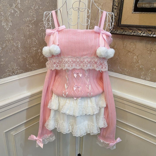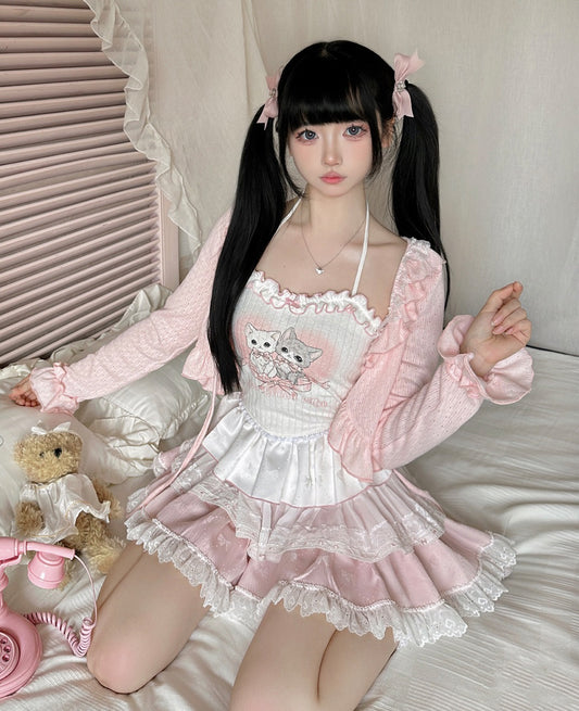 Coquette Love Song Cat Camisole & Pink Cardigan & Ruffled Skirt Three Piece Set