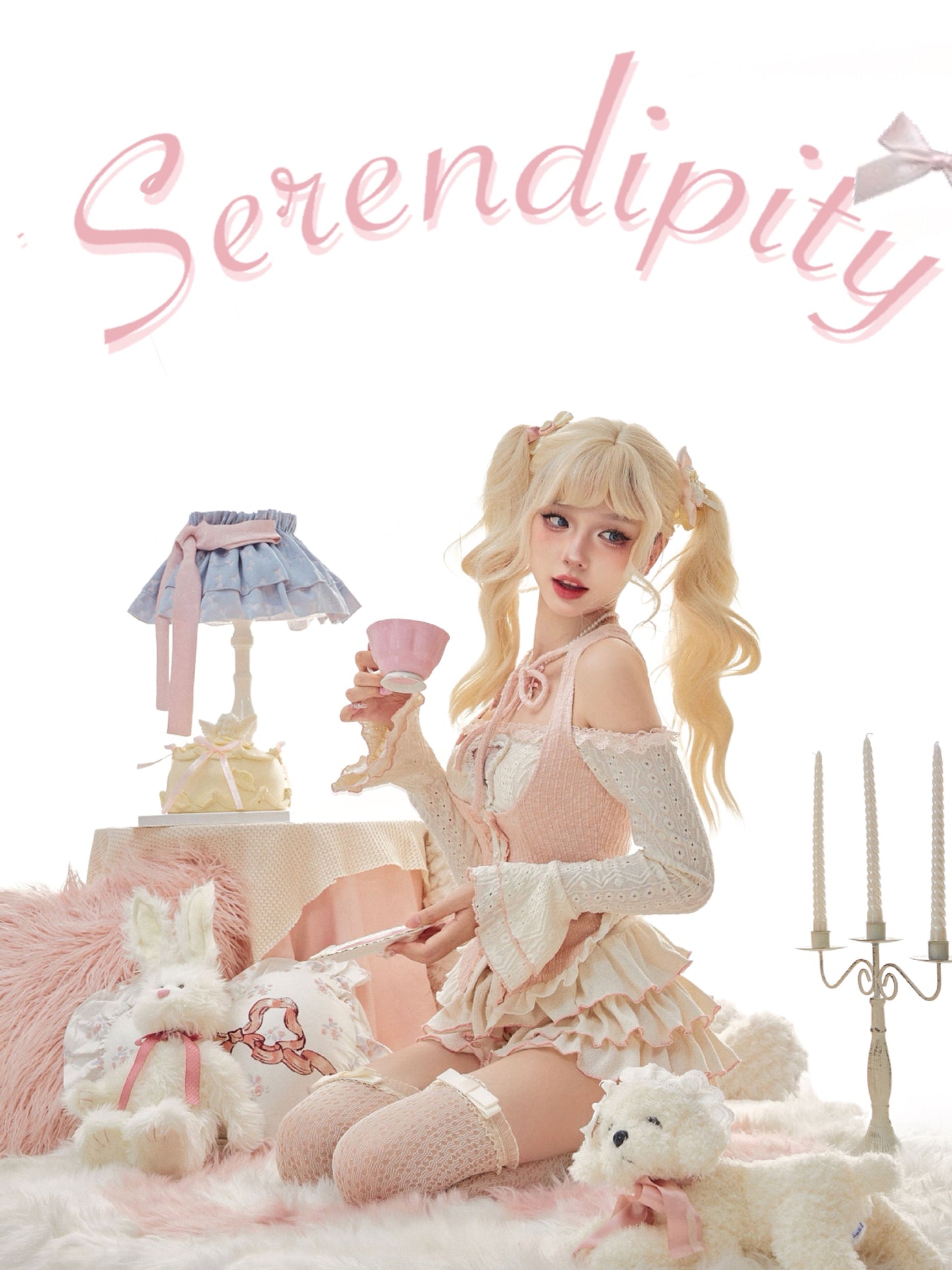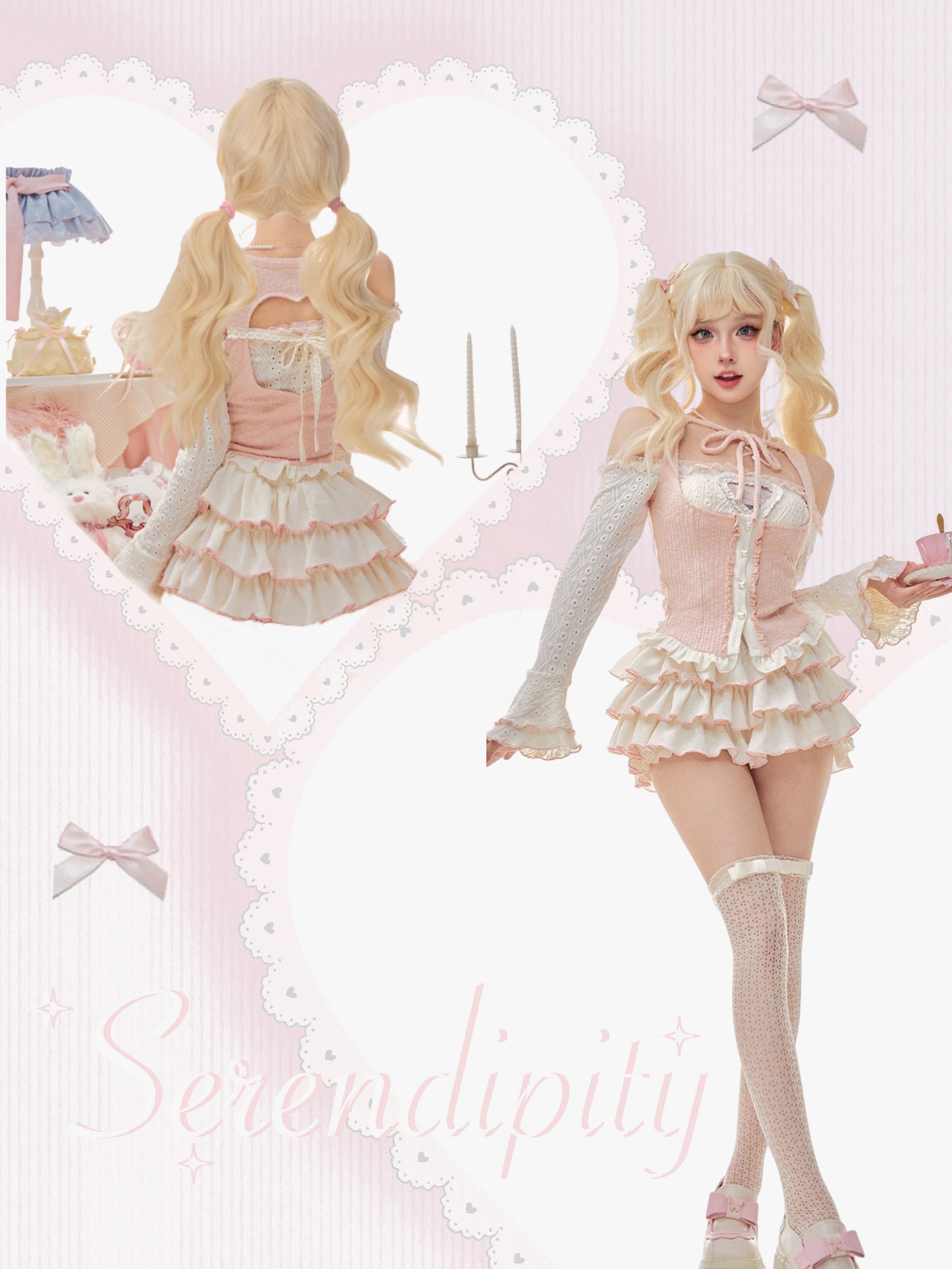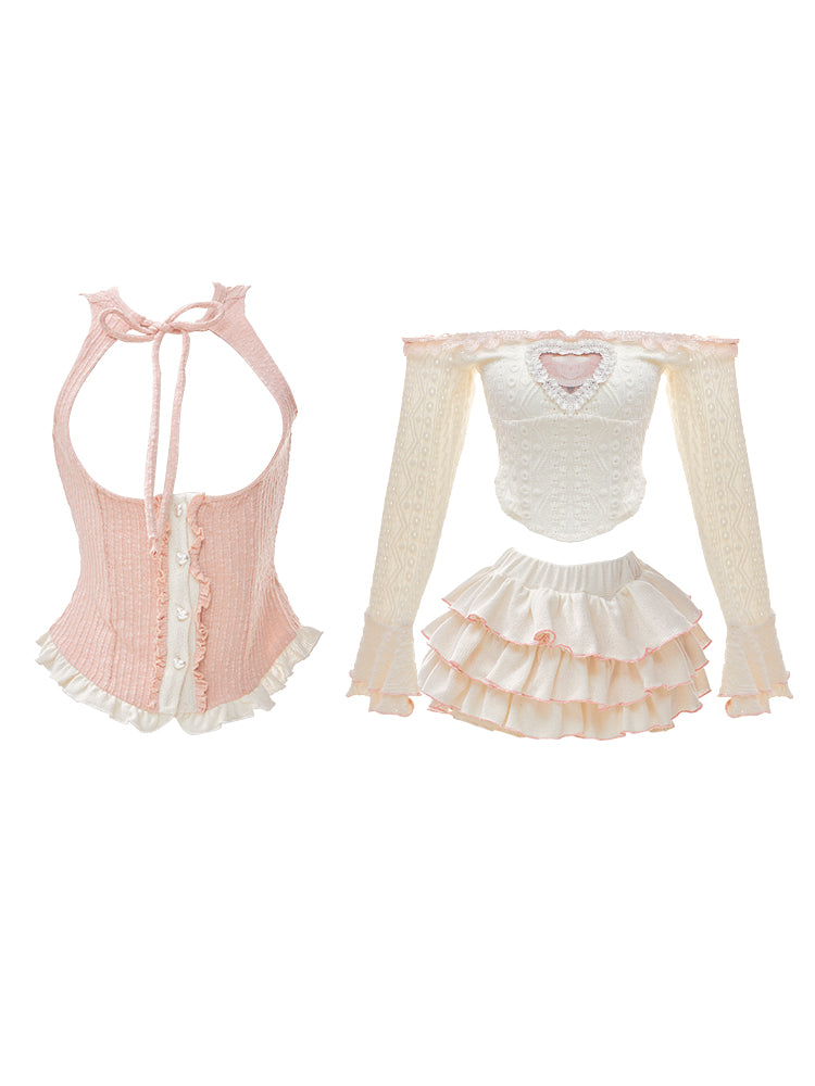 Serendipity Angel Love Coquette Balletcore Pink White Vest Long Sleeve Shirt Skirt Three Piece Set