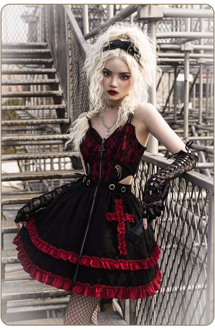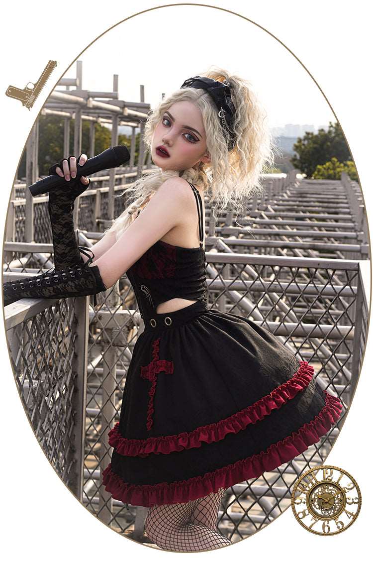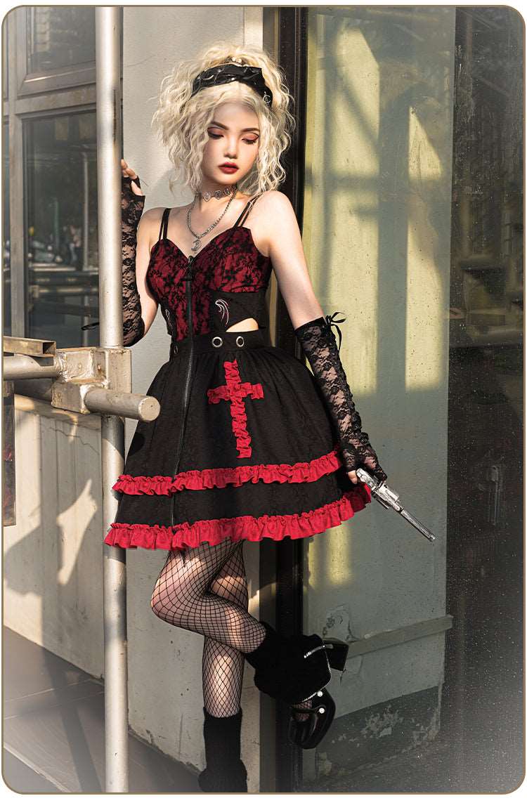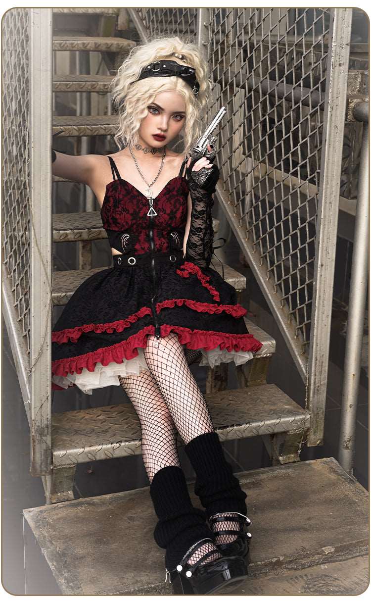 Universal Lolita Judgment Day Black Red Strap Dress Vest Sleeves Three Piece Set