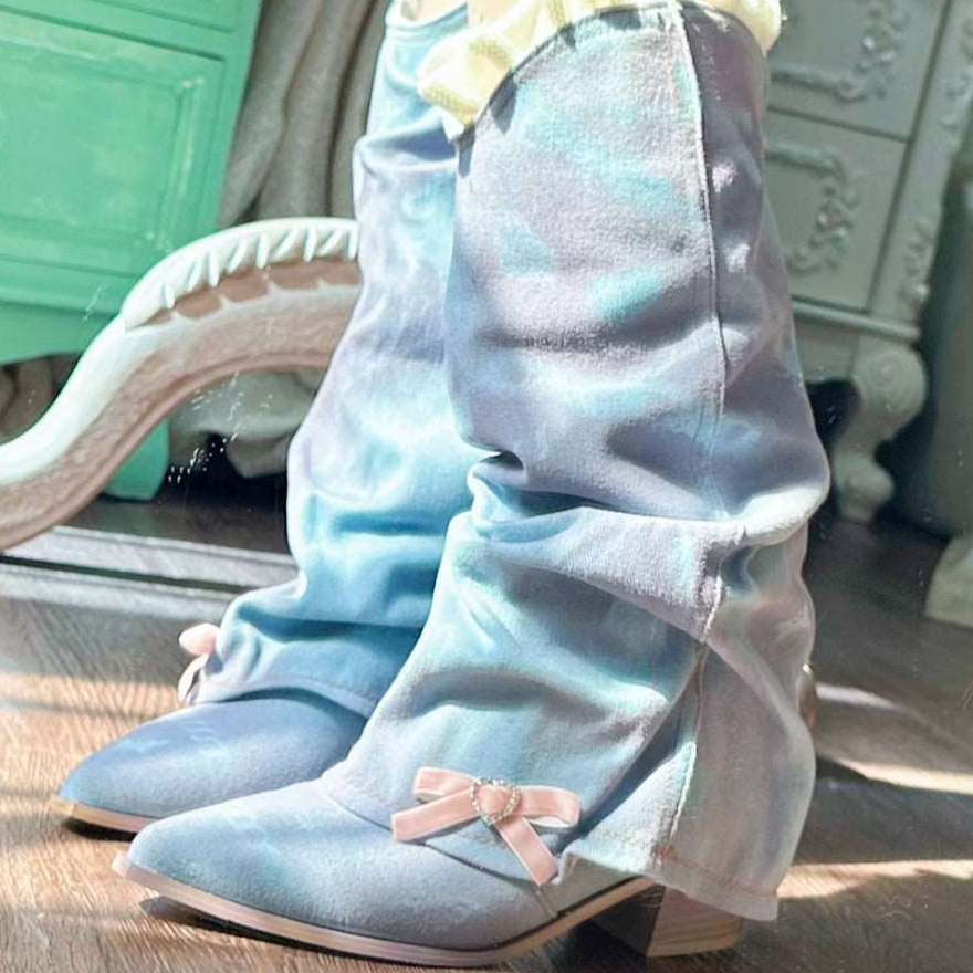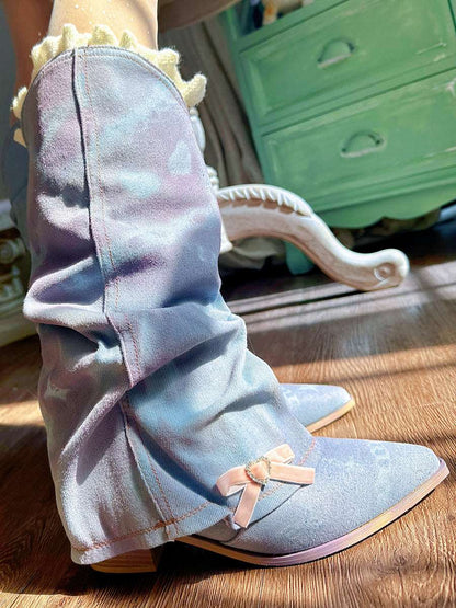 Pinky Blue Purple Coquette Style Bow Retro Denim Western Boots