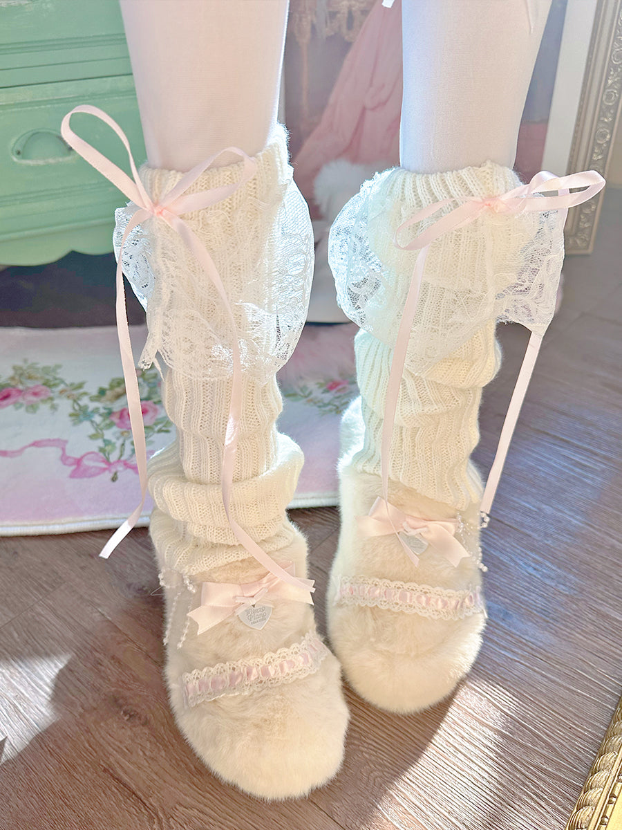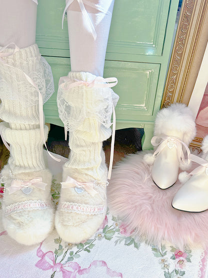 Pinky Coquette Pink Bow Lace Velvet Snow Winter Cute Slippers Shoes