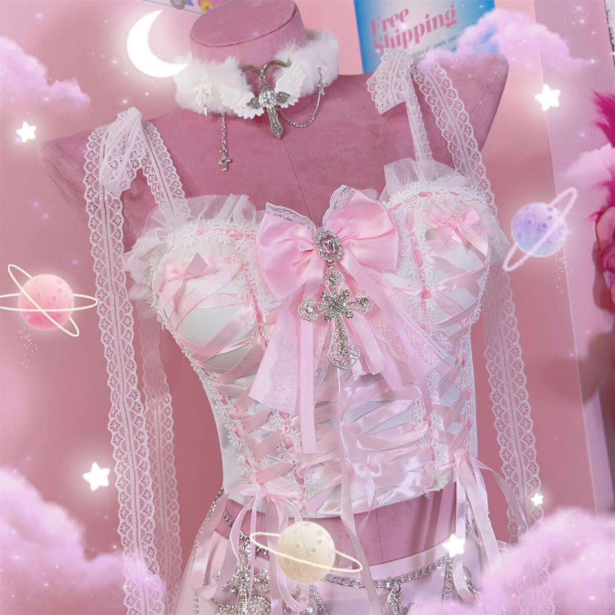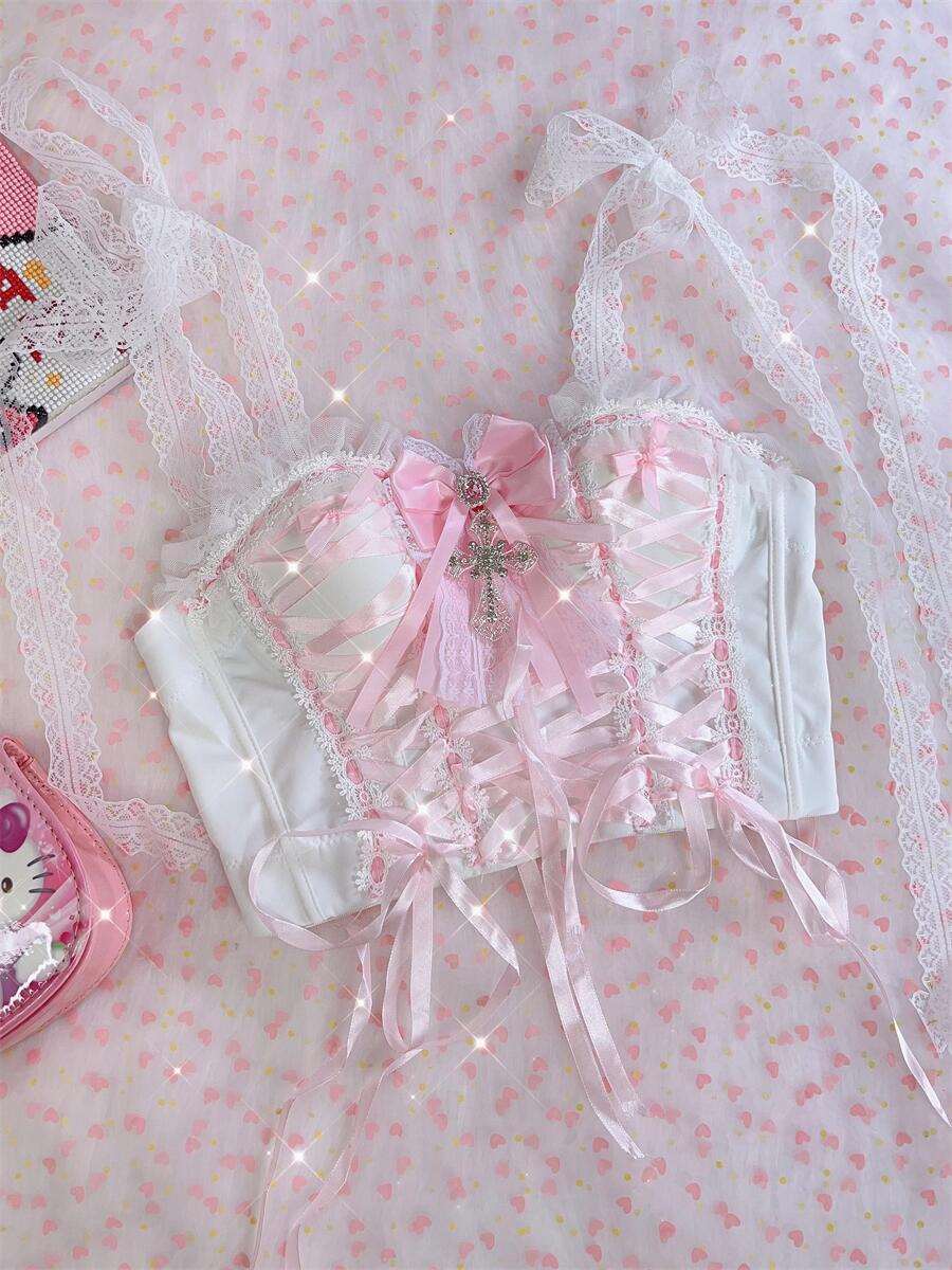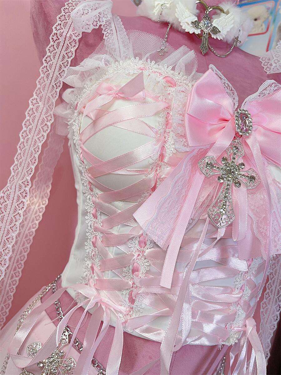Coquette Sexy Millennial Girl Kitty Lace White Camisole & Skirt Two Piece Set