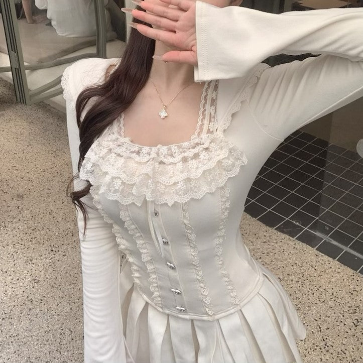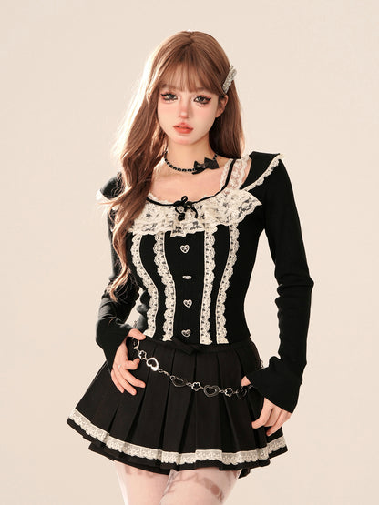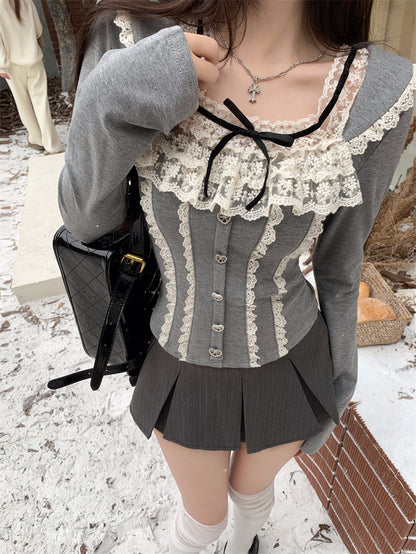 Young Eyes Coquette Square Collar Lace Black Gray White Shirt Top