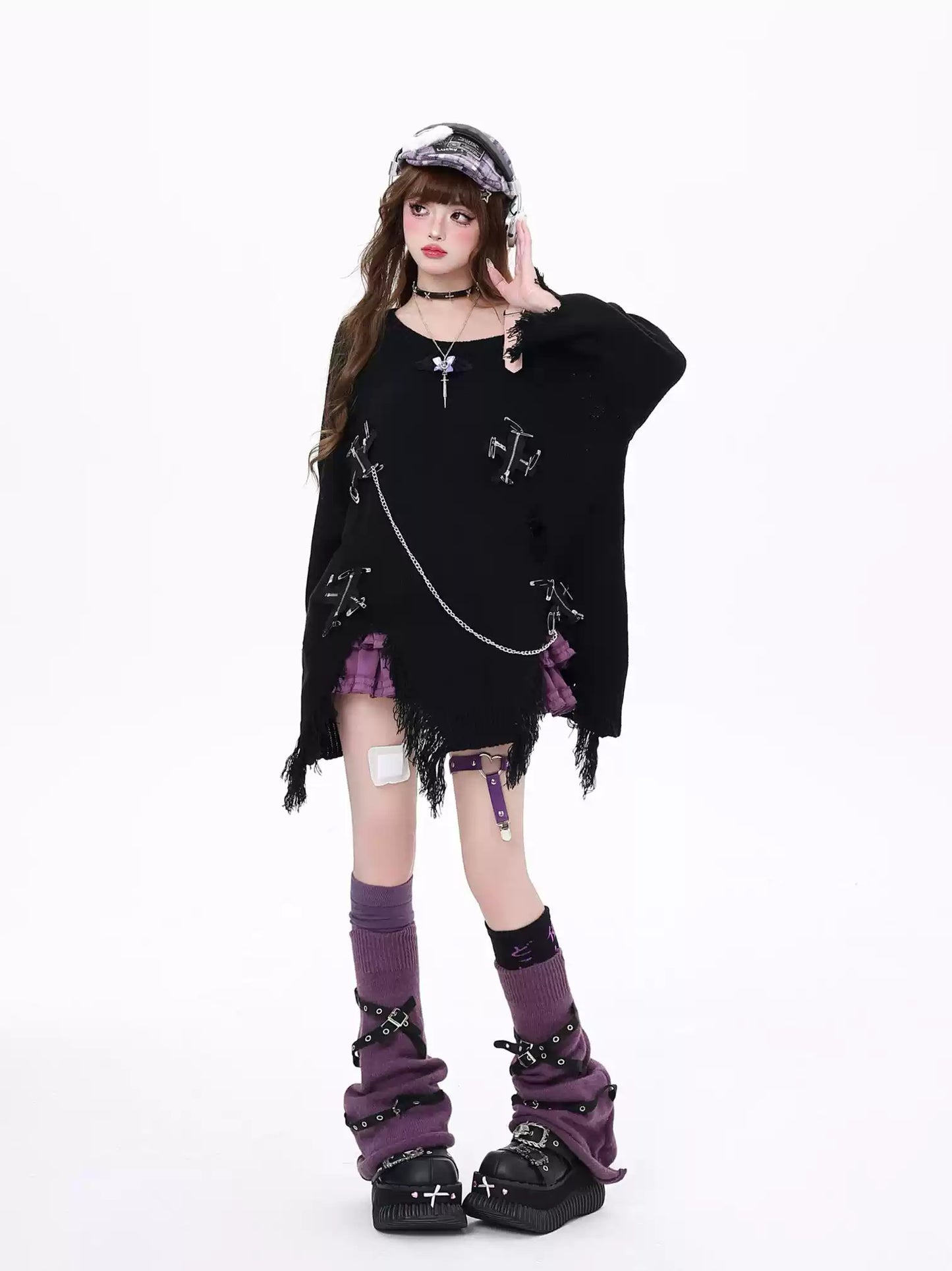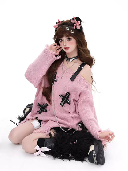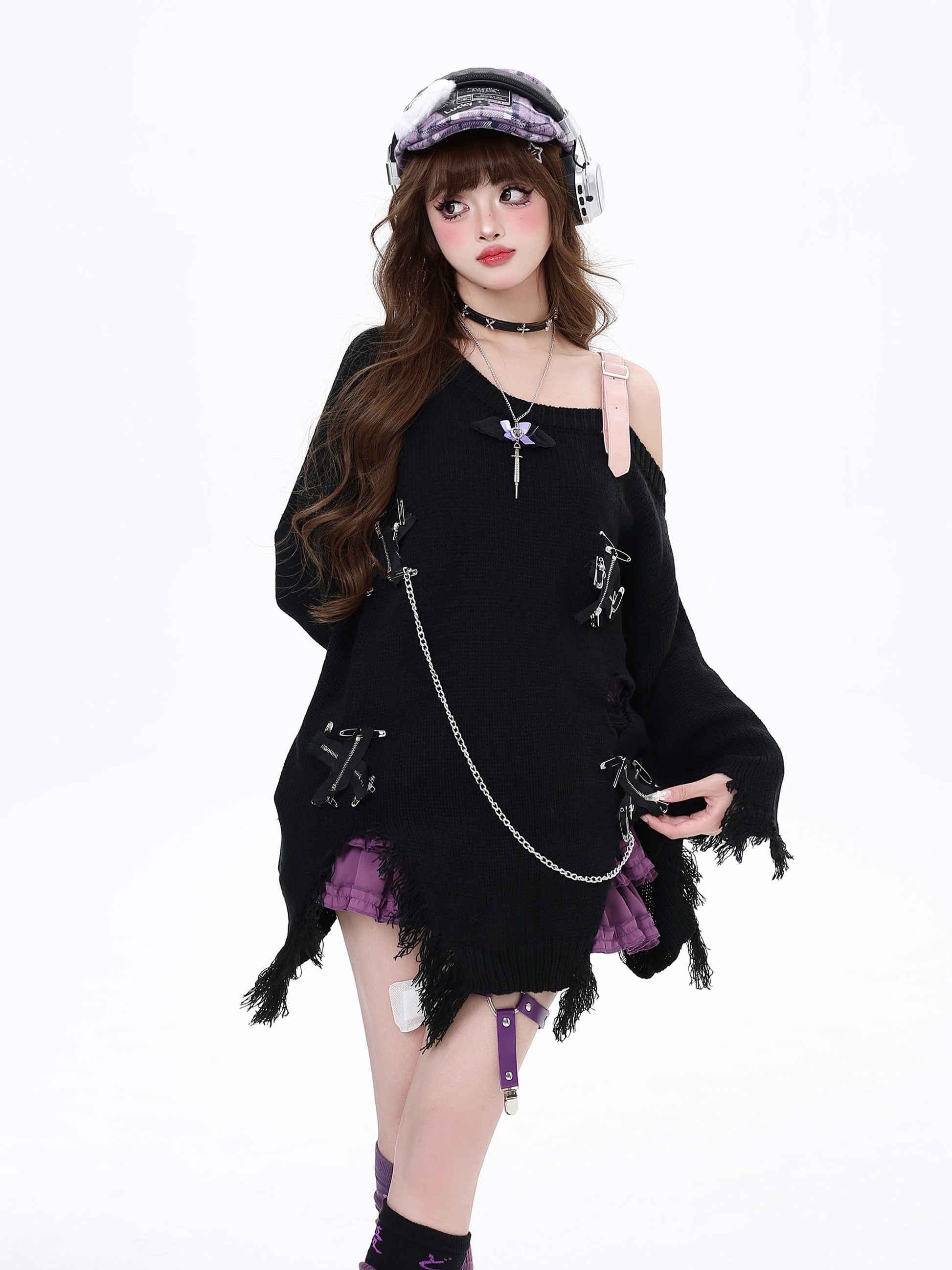 Crazy Girl Cross Senses Purple Black Pink Off Shoulder Knit Sweater