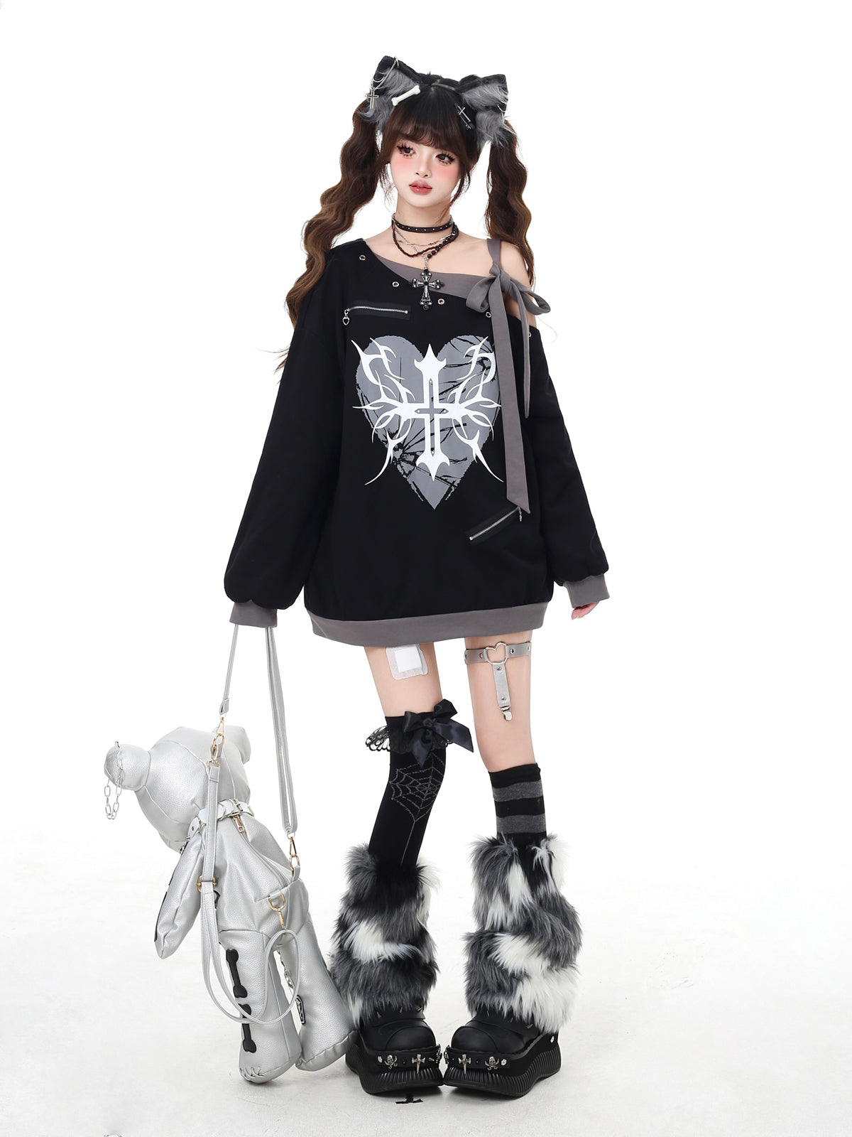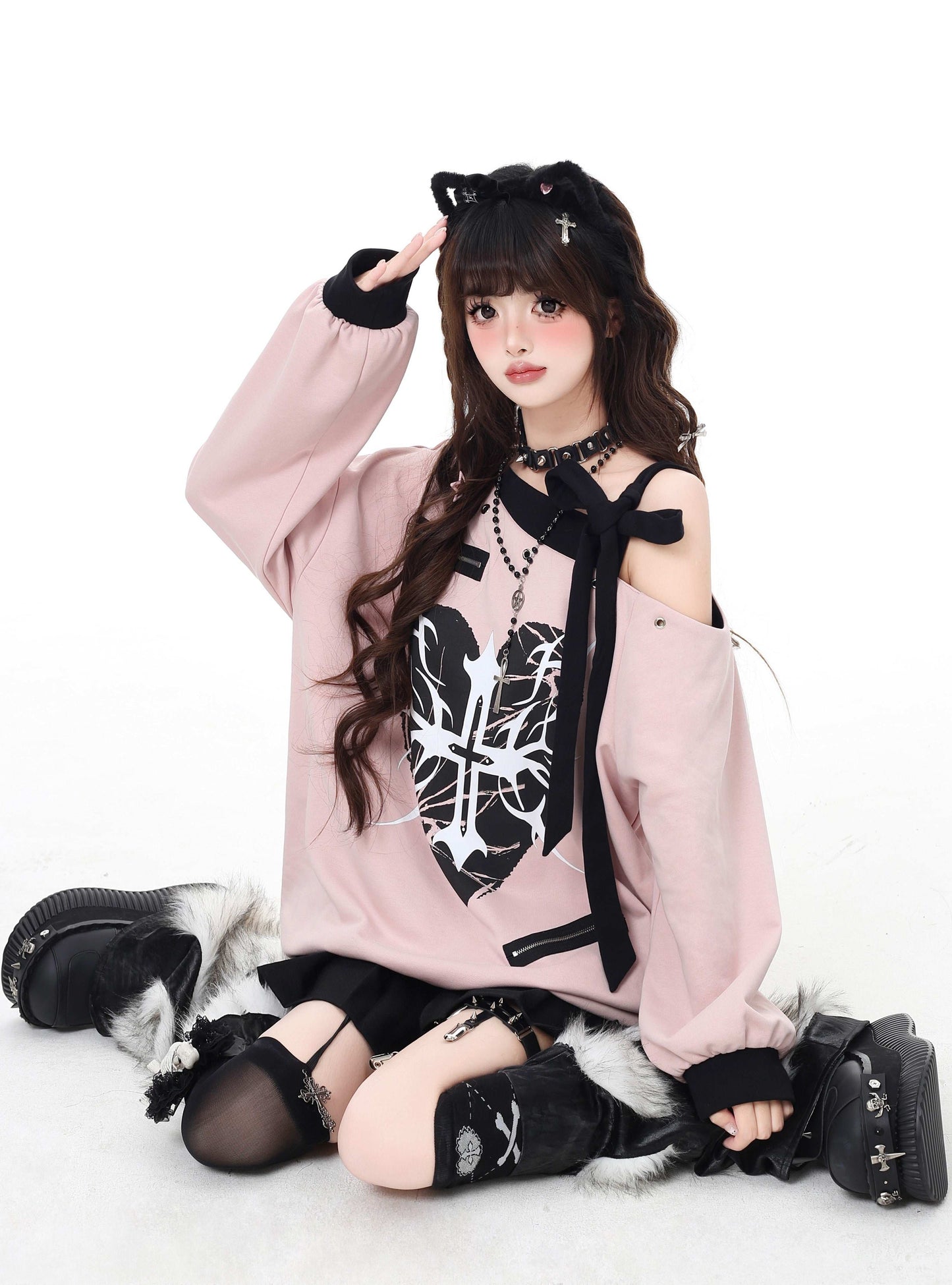 Crazy Girl Frost Witch Heart Cross Pink Black Off Shoulder Sweater Top