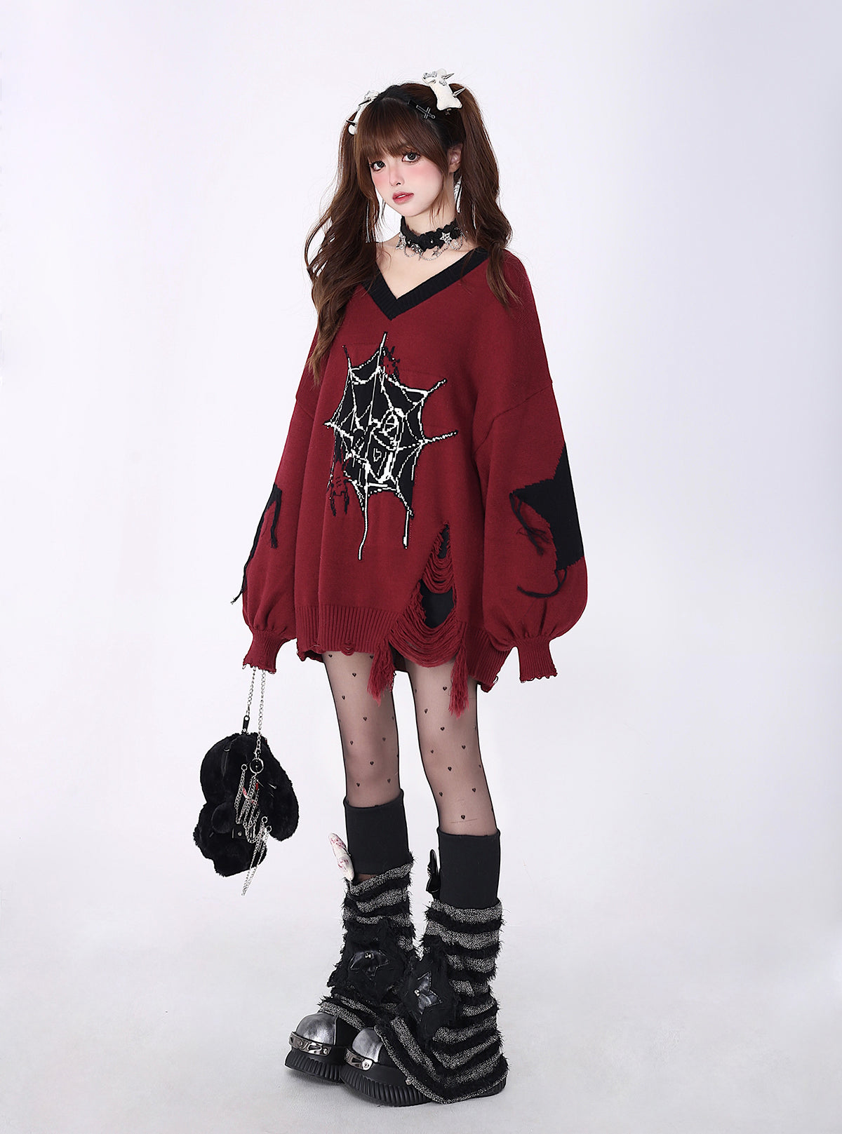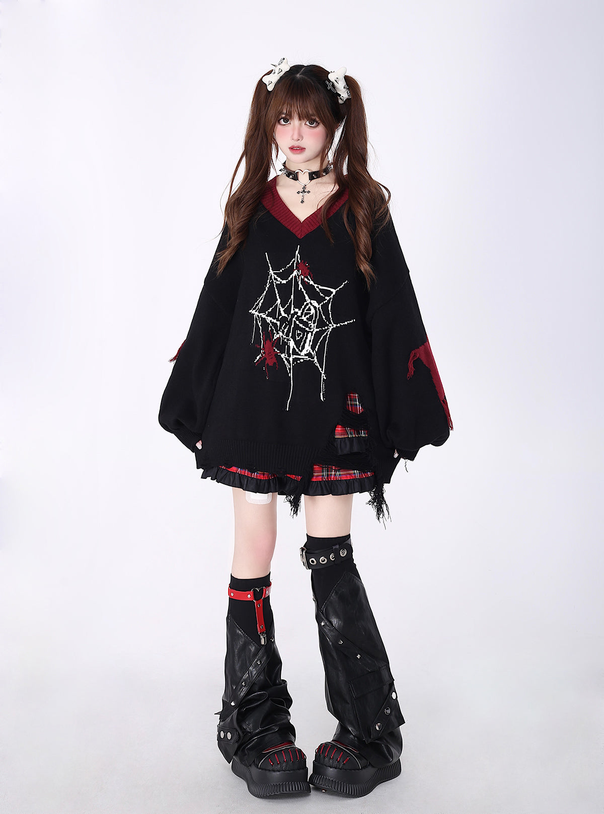 Crazy Girl Love Cycle Spider Web Red Black Sweater Top