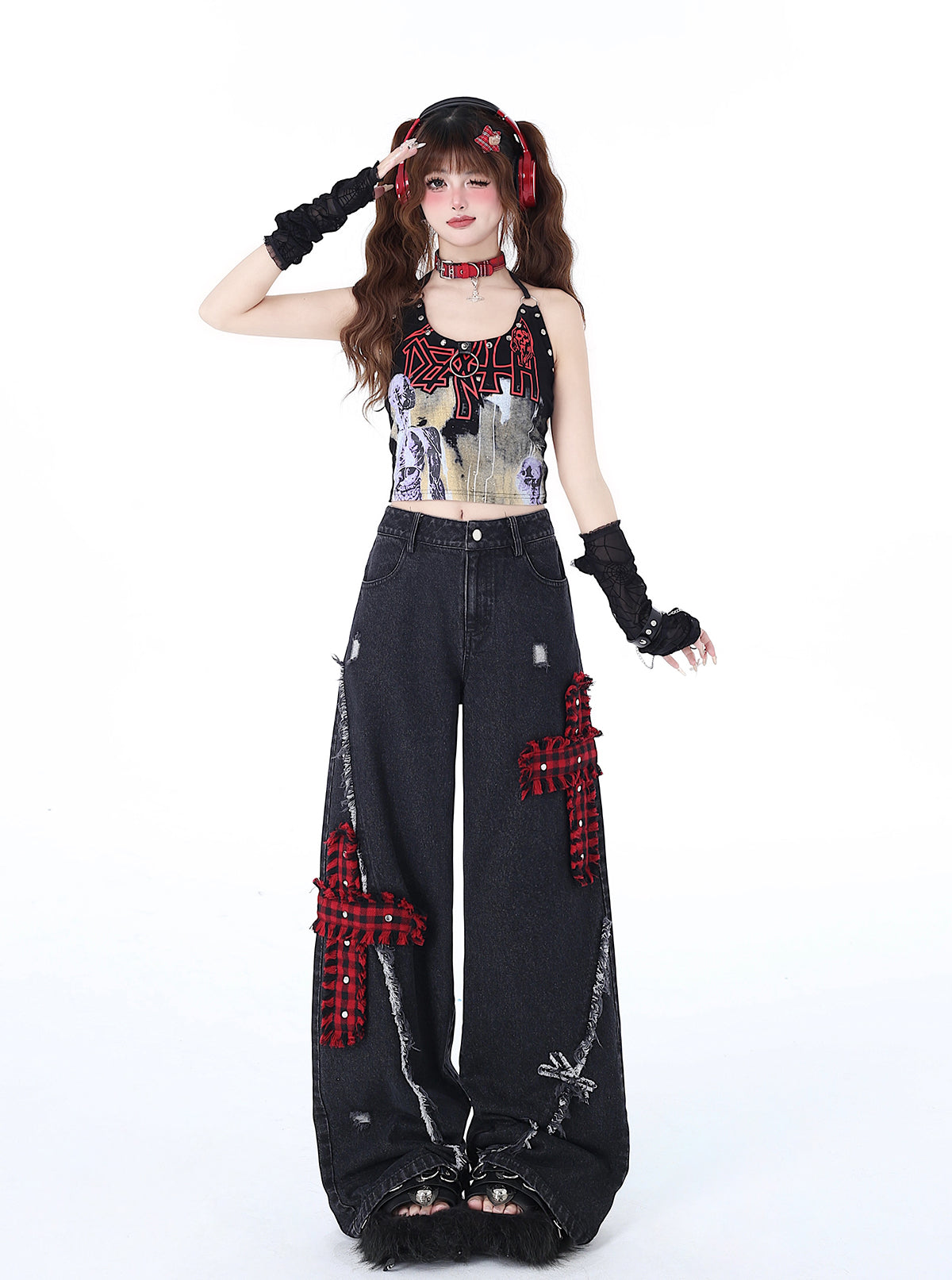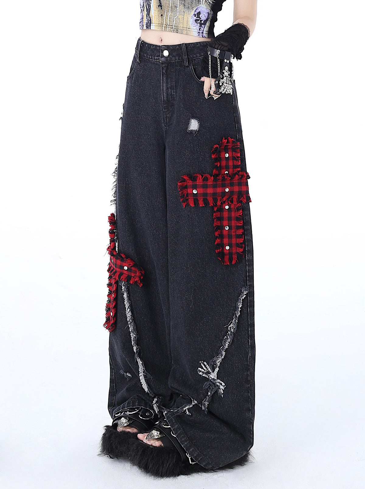 Crazy Girl Street Diary Red Plaid Cross Black Wide Leg Denim Jeans