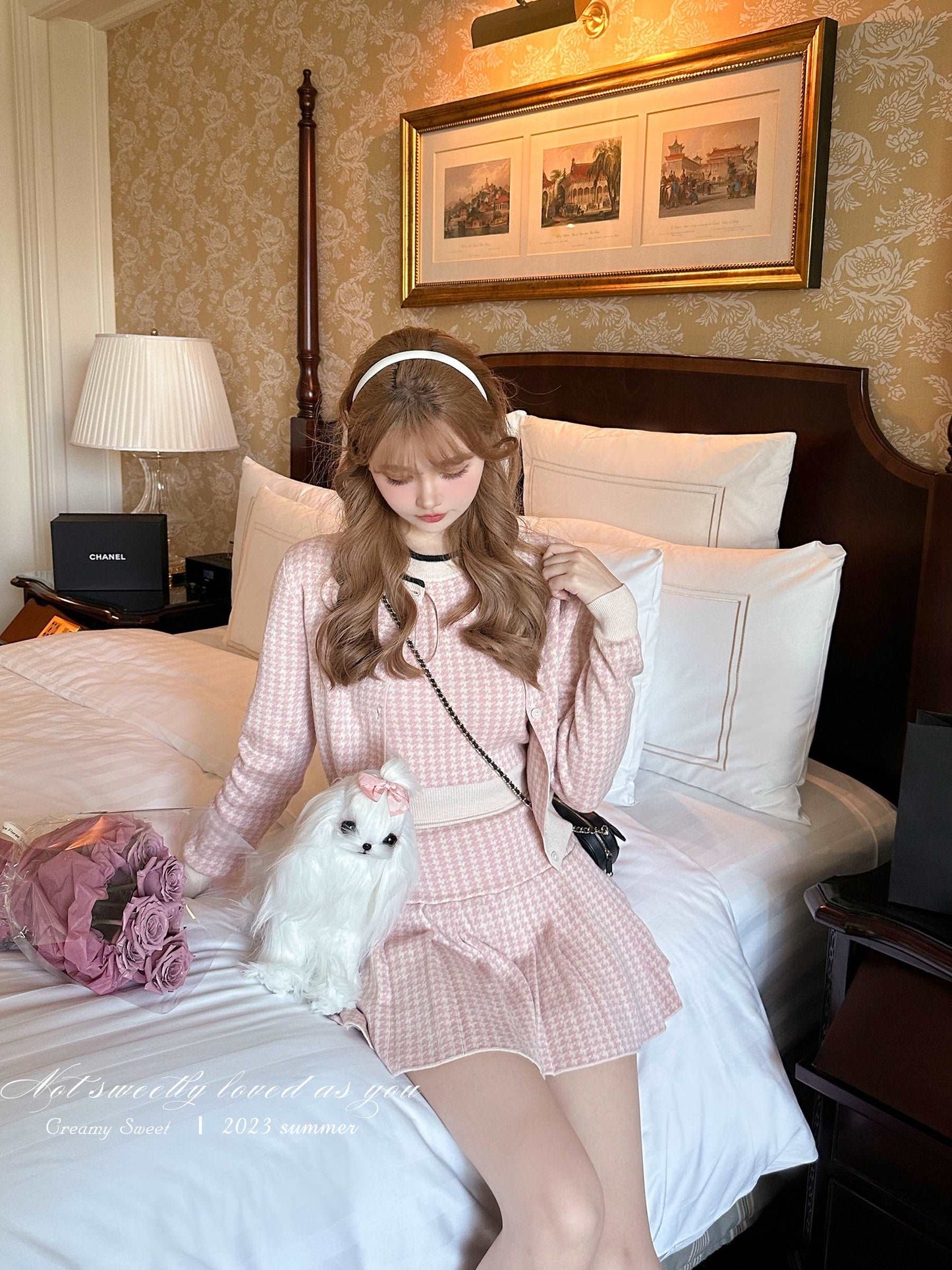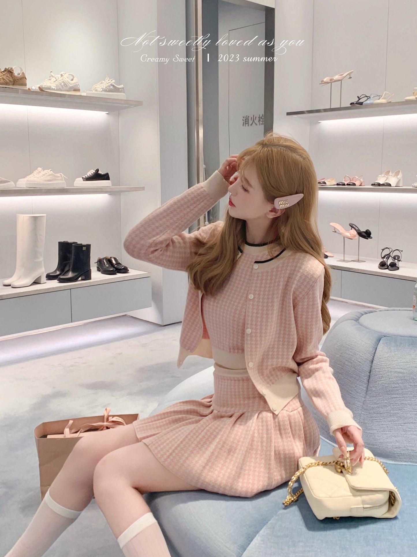 Creamy Cute Houndstooth Knit Pink Vest Cardigan Pleated Skirt Three Piece Set