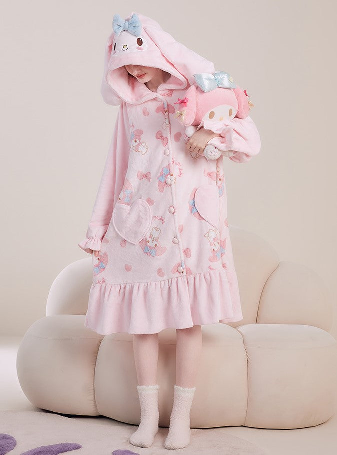 Pink Cartoon Melody Plush Coral Fleece Winter Pajamas Hooded Tops & Pants Two Piece