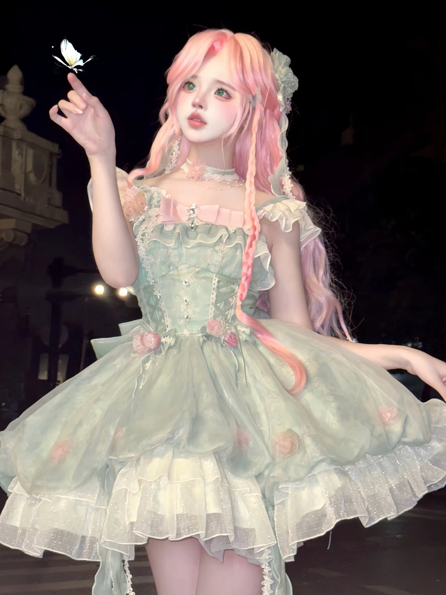Become a mythical spring forest fairy in our Platycodon Girls Pink Green Lolita Dress! Complete the look with the matching train for a beautiful trailing bow! Perfect for any fairy enthusiast, this dress will surely inspire and enchant.