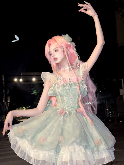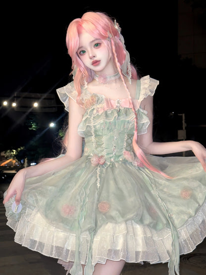 Platycodon Girls Spring Forest Fairy Pink Green Lolita Dress