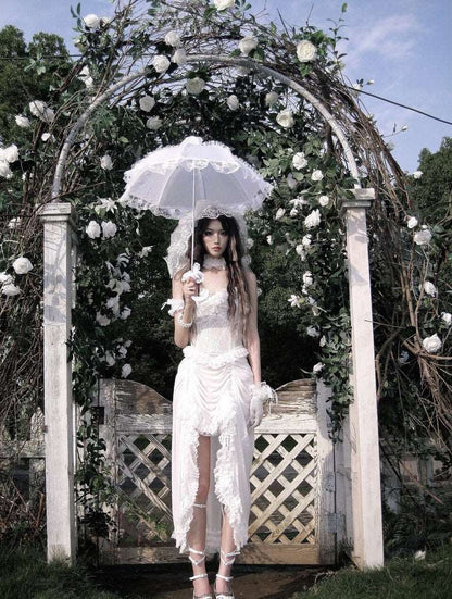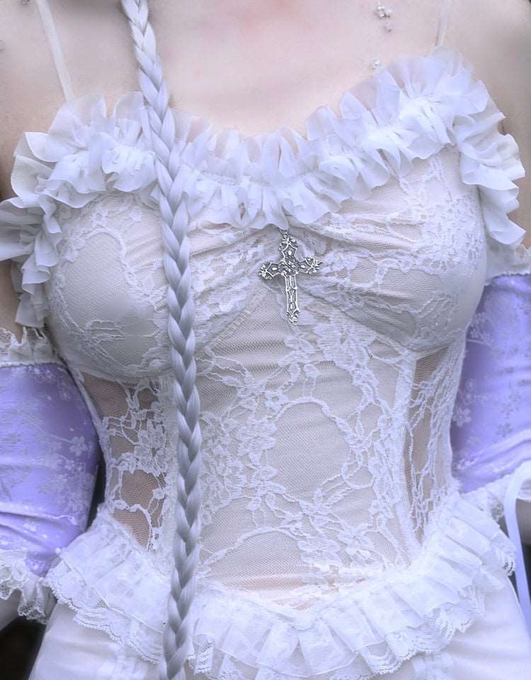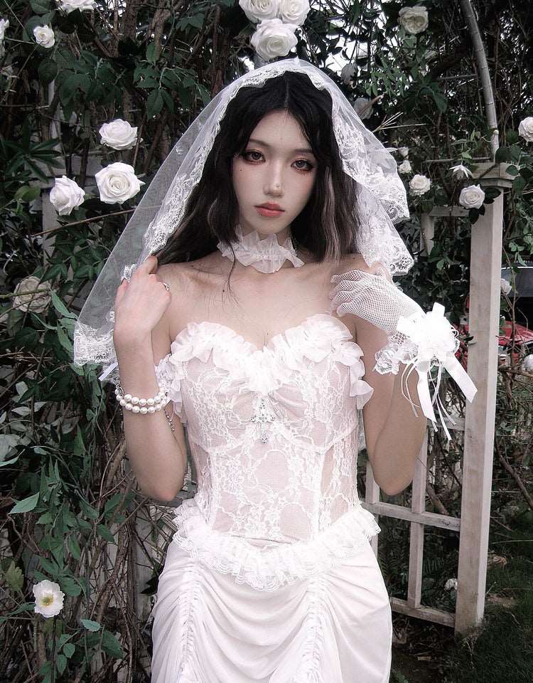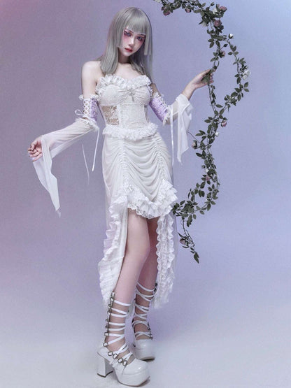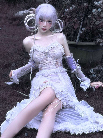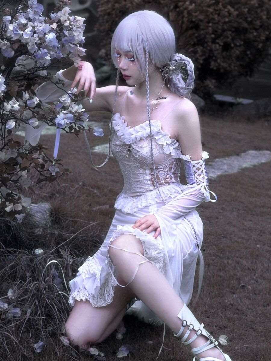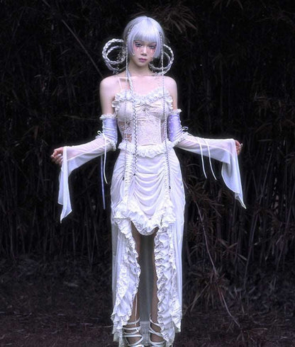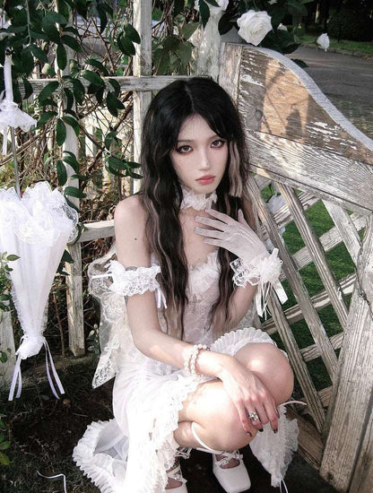 Gothic fairy dress with comfortable stretch mesh gives you a soft feeling while wearing due to its elasticity and stitching with jacquard lace and V collar. The drawstring can also be adjusted. You may purchase arm warmers for a final touch of a fairytale.