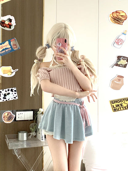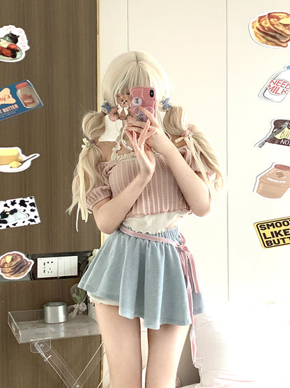 Serendipity Balletcore White Lace Halter Neck Tank Top & Pink Shirt & Blue Skirt Three Piece Set