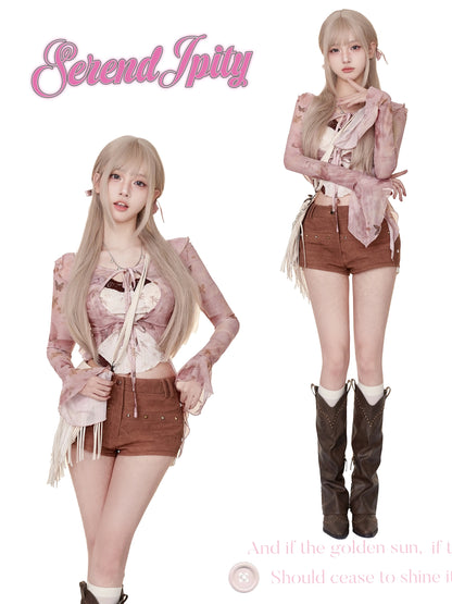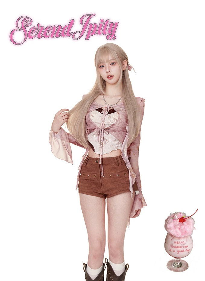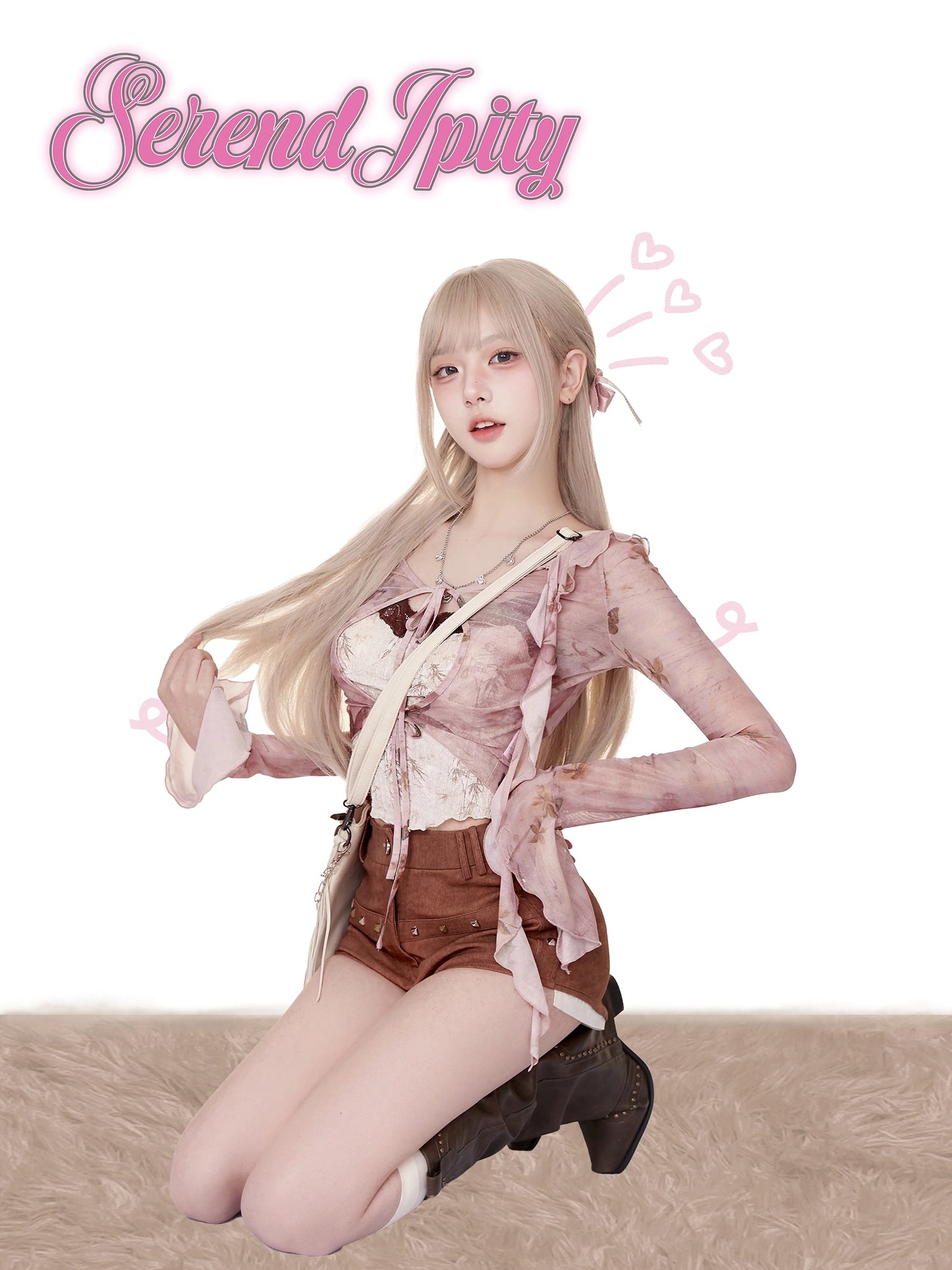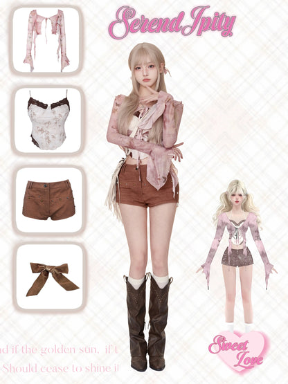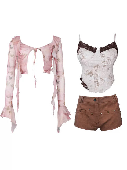 Experience the charm with our Serendipity Broken Butterfly Pink Cardigan & Camisole & Brown Shorts set. Stay cool and on-trend with this y2k-inspired three-piece ensemble. Channel your inner butterfly and stand out from the crowd with this unique and stylish set.