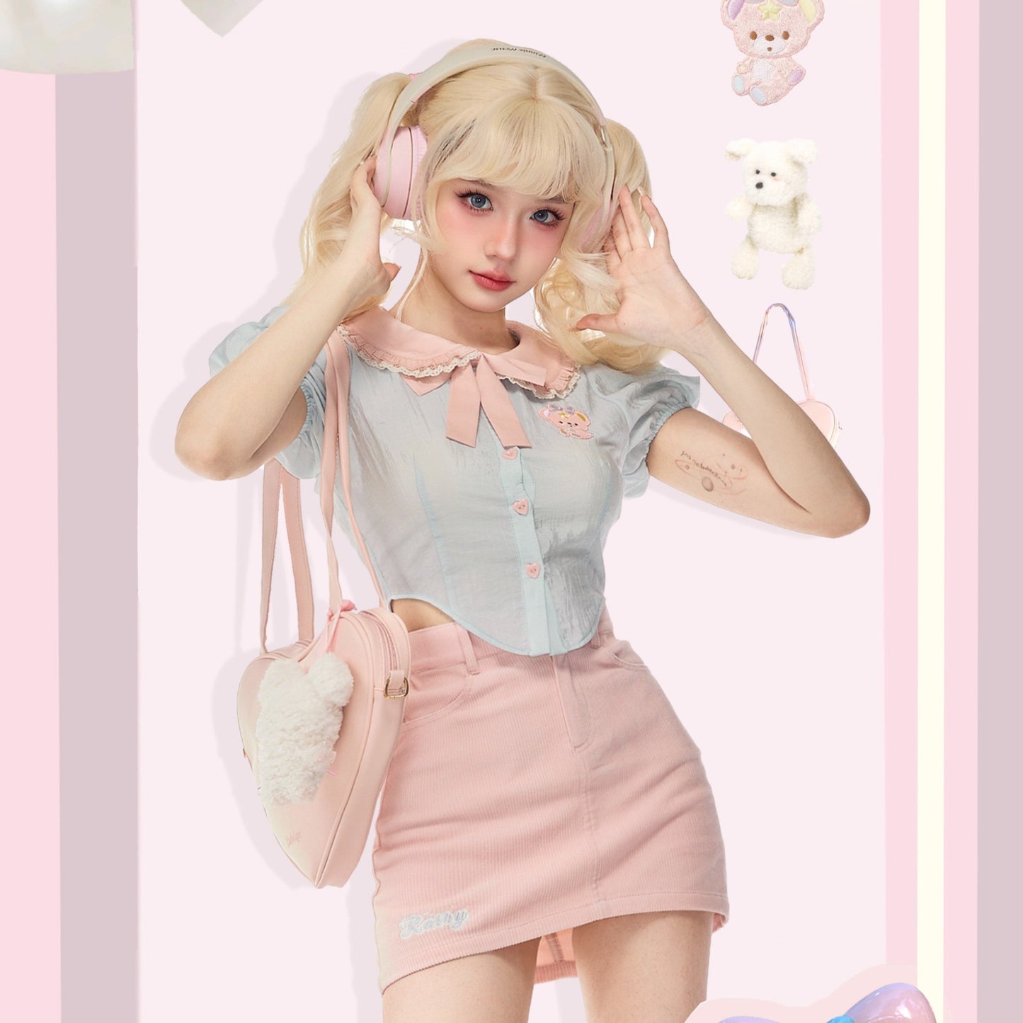 Serendipity Cute Teddy Bear Embroidery Blue Puff Sleeve Shirt & Pink Skirt Two Piece Set