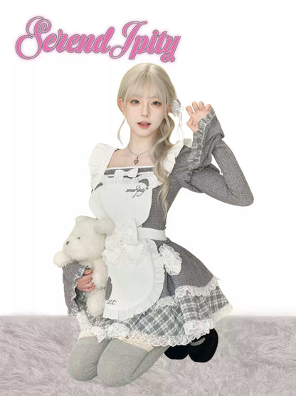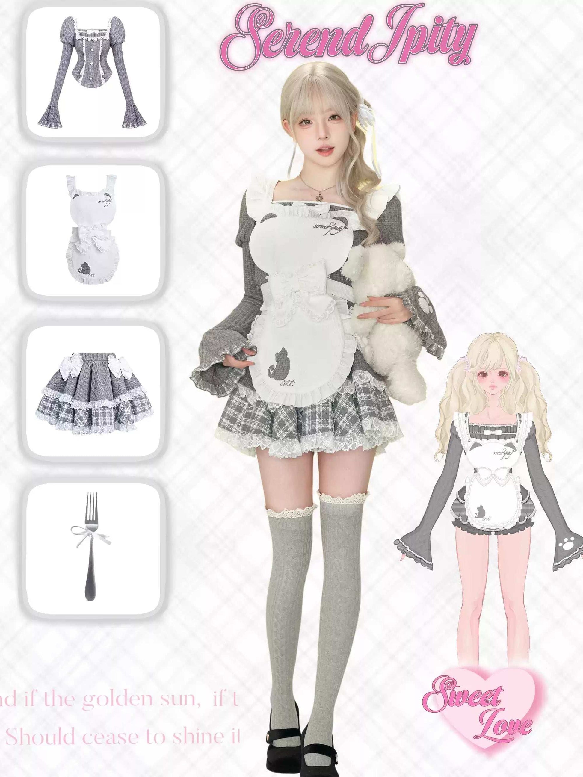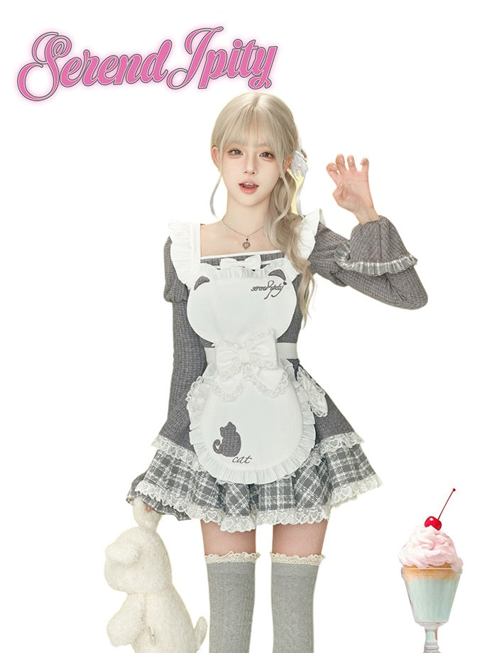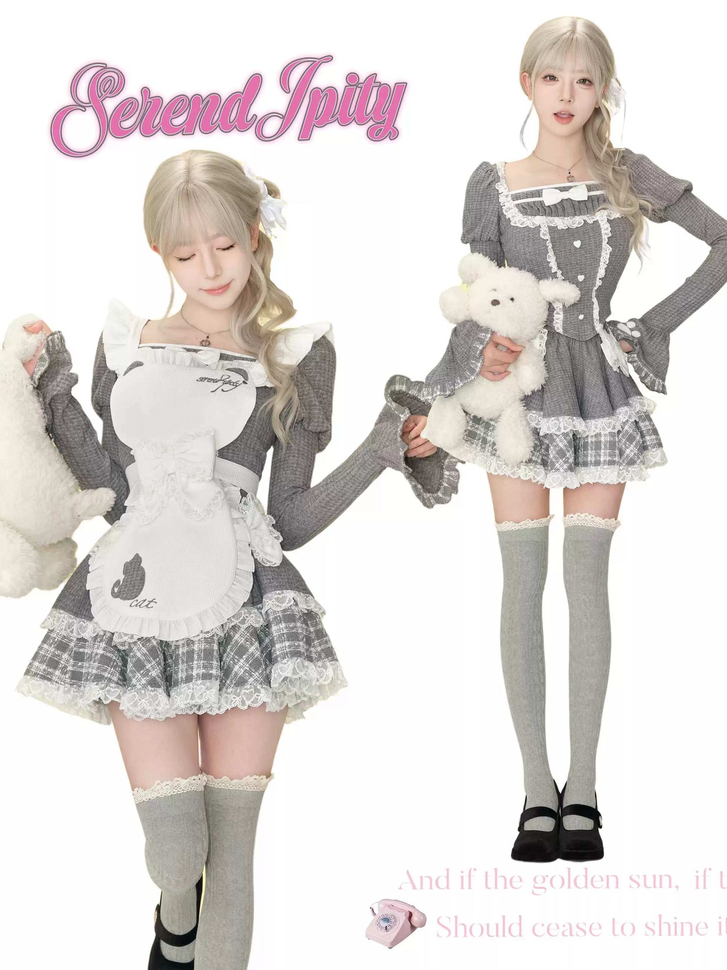 Serendipity Dessert Series Gray Sweater Top & Apron & Skirt Three Piece Set