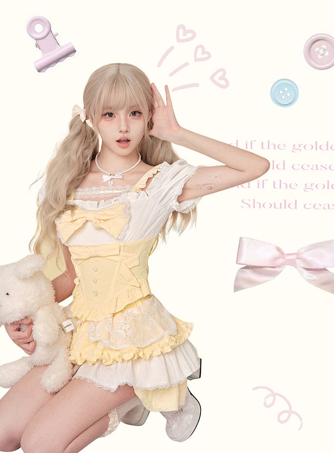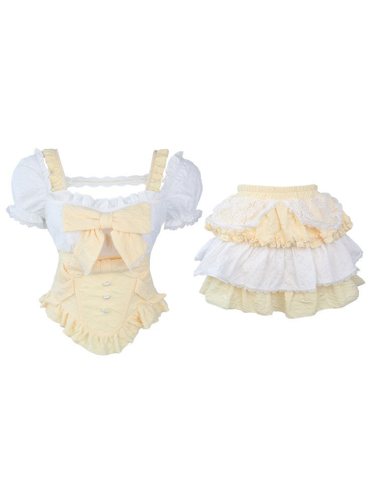 Serendipity Yellow Custard Puff Sleeve Top & Skirt Two Piece Set