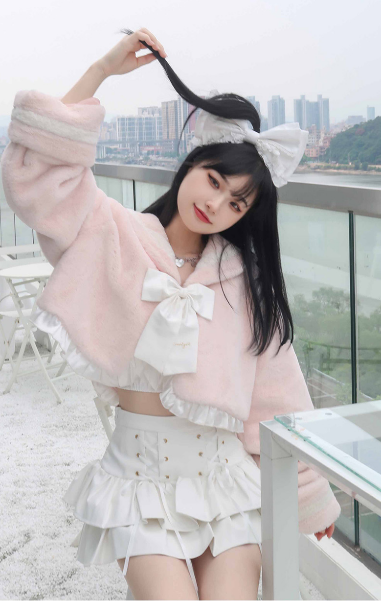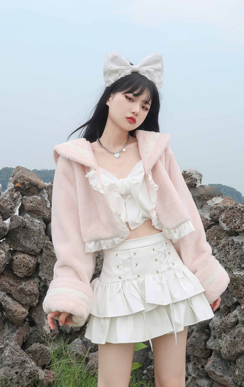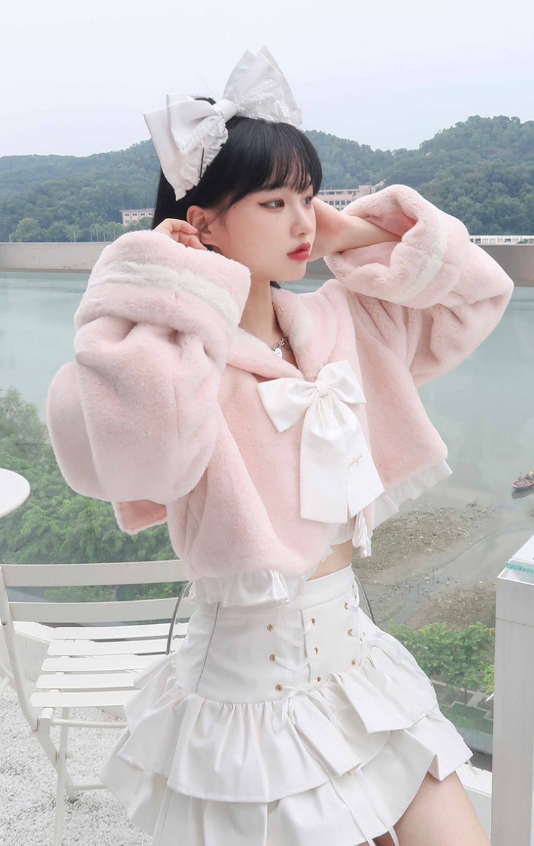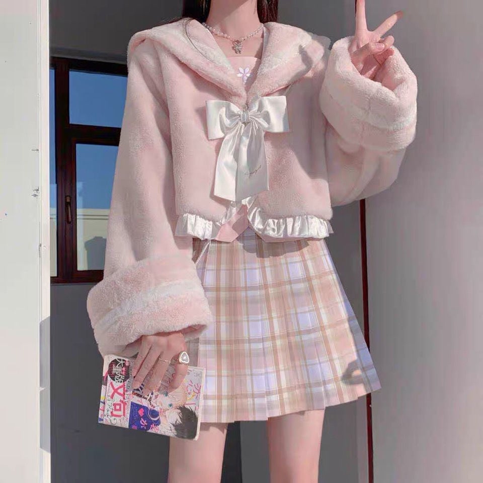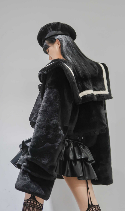 Sweet Sakura Lolita Pink & Black Navy Collar Plush Jacket Coat