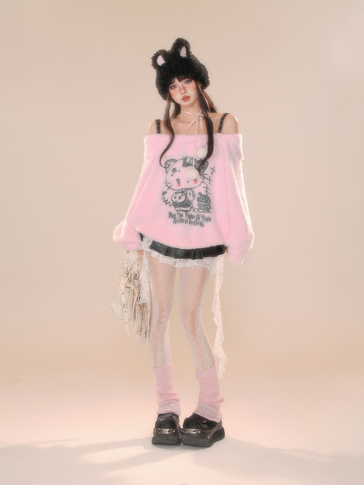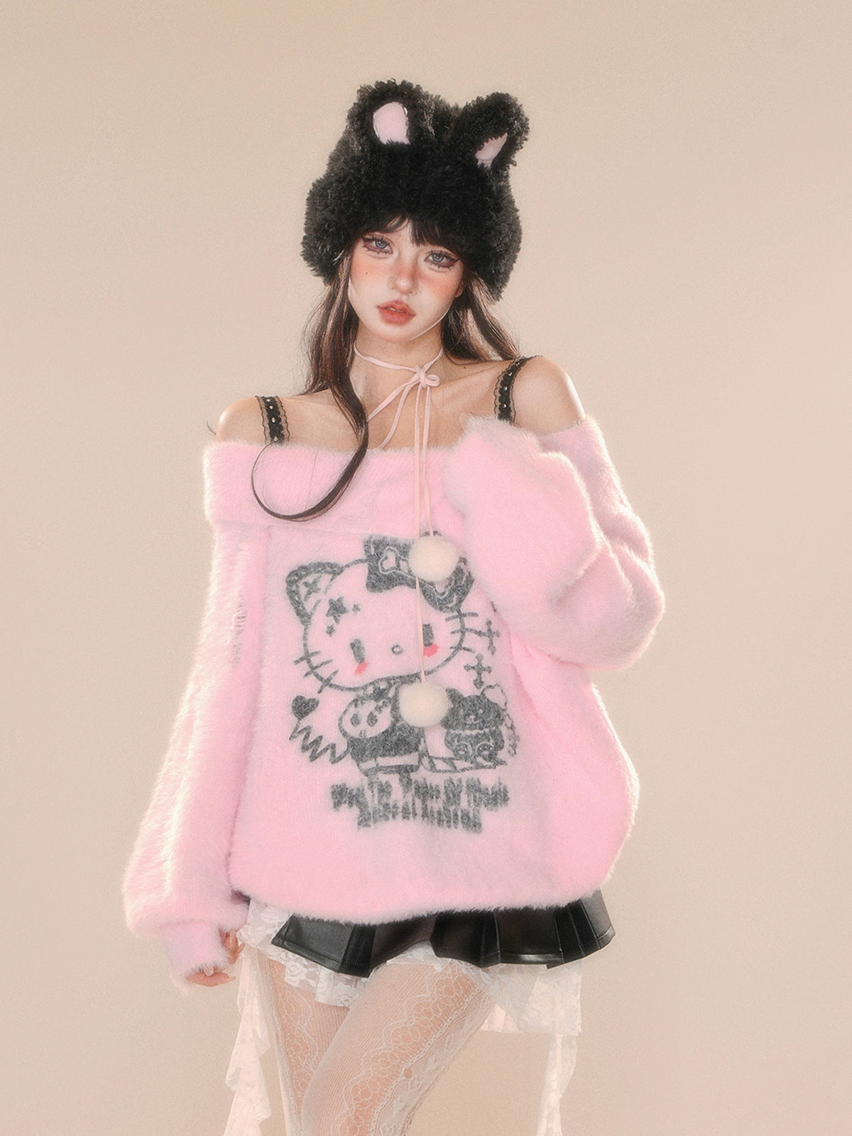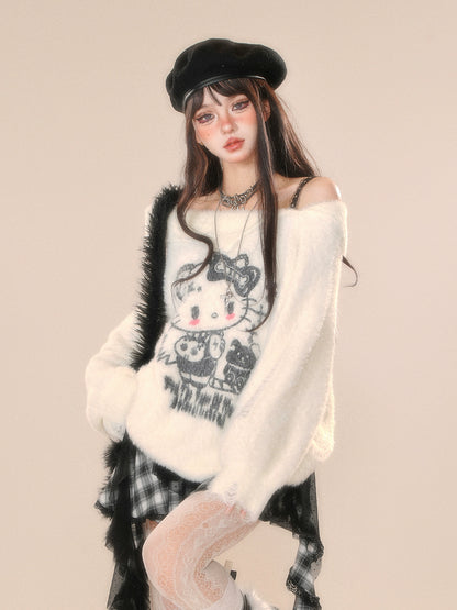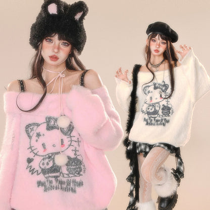 Young Eyes Cupid Kitty White Pink Off Shoulder Fuzzy Sweater