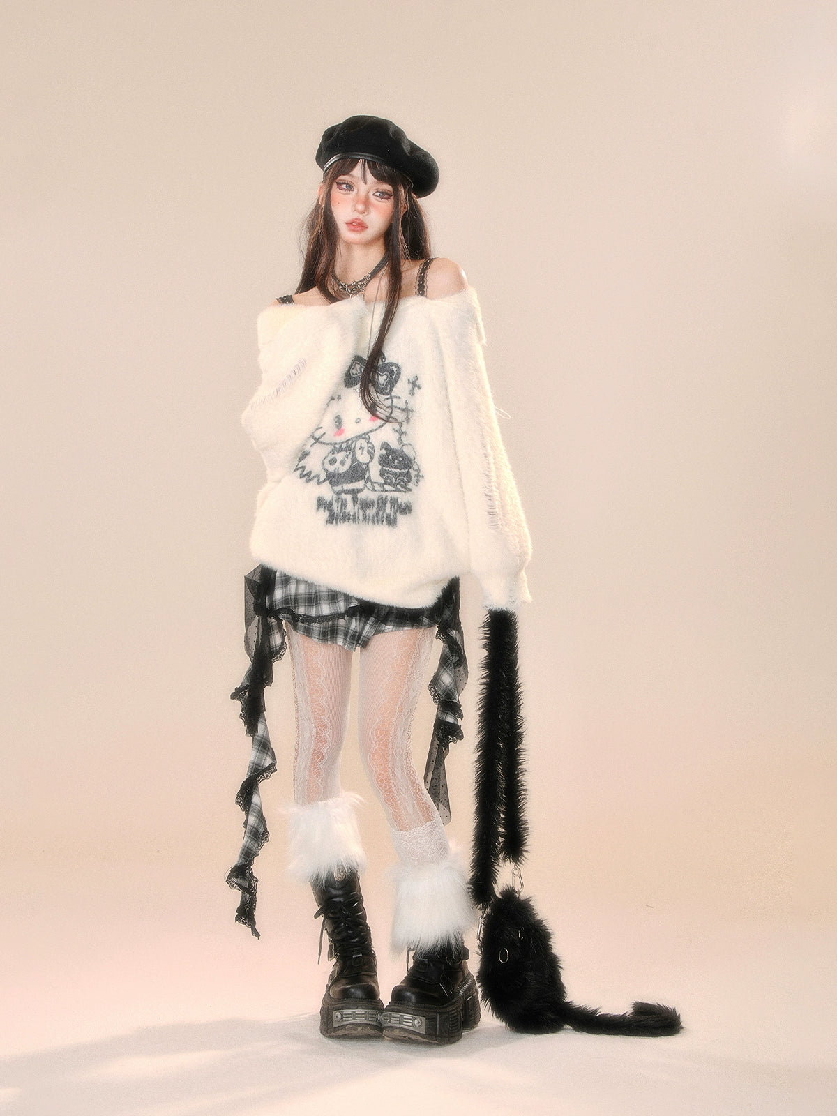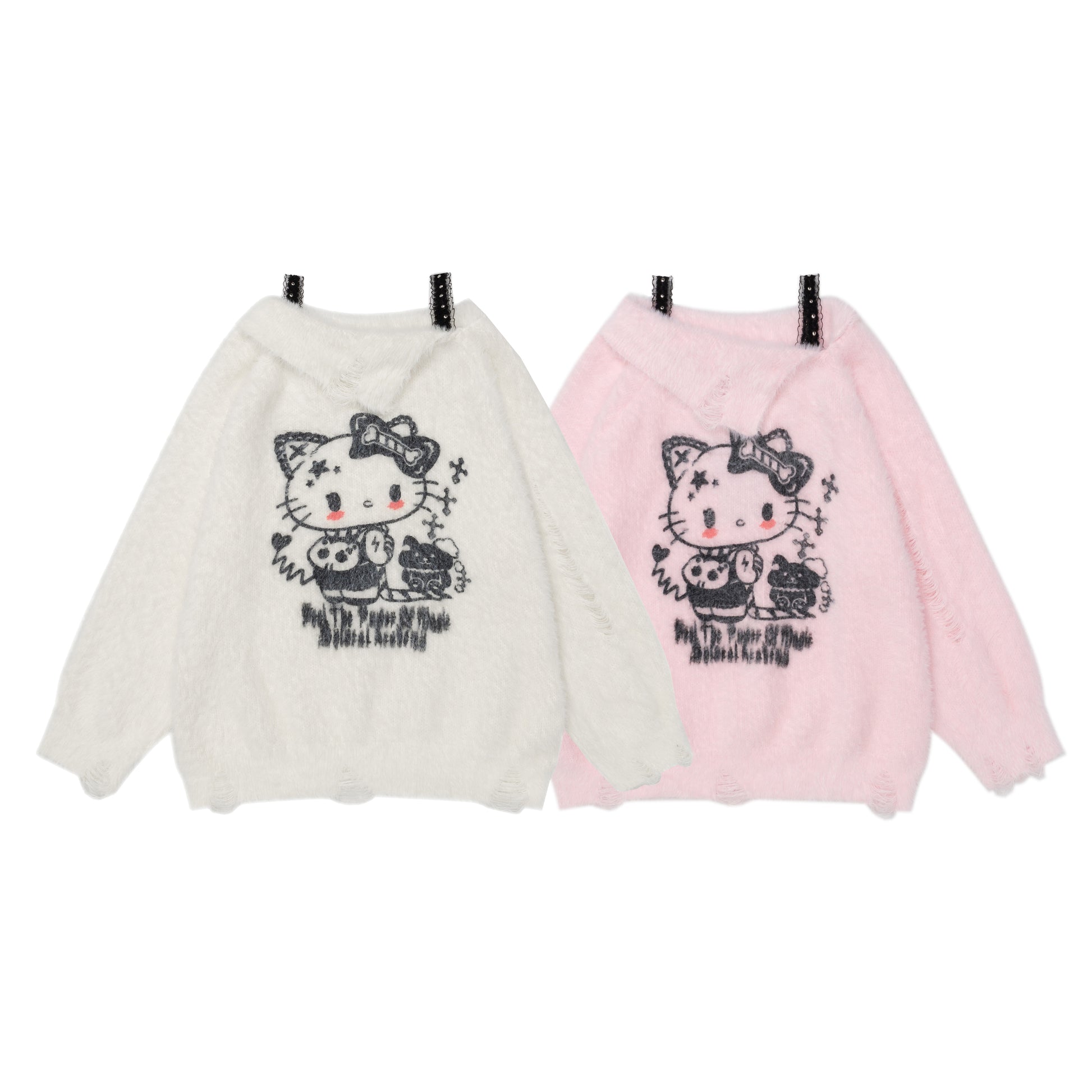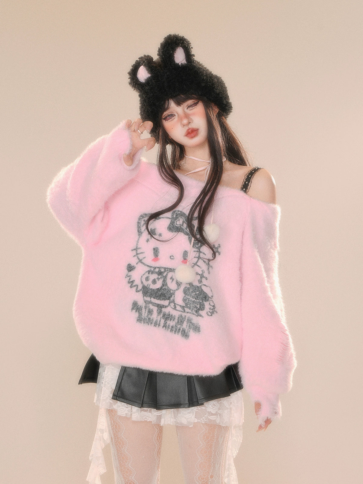 Young Eyes Cupid Kitty White Pink Off Shoulder Fuzzy Sweater