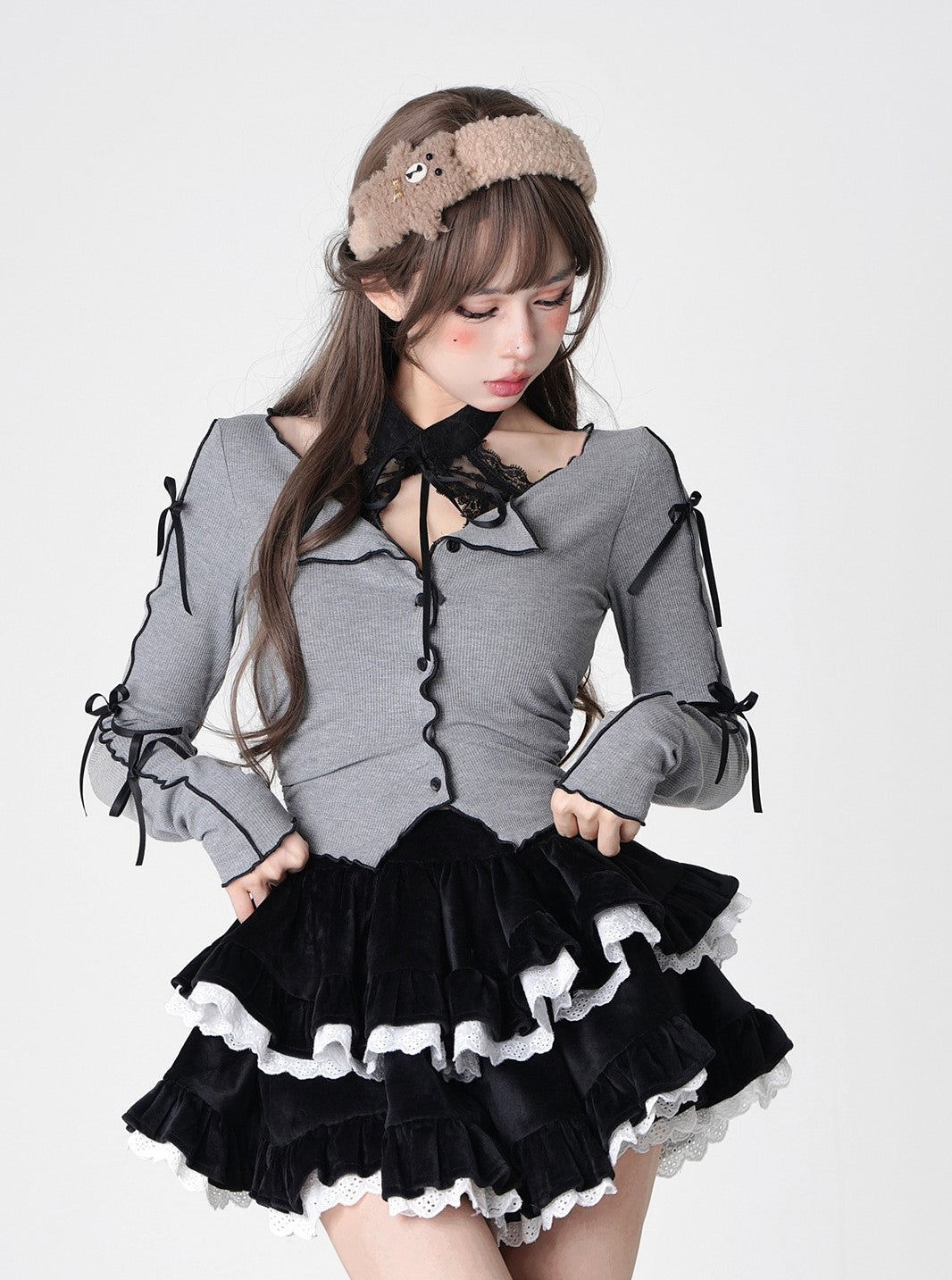Young Eyes Gray Bow Shirt Top & Corduroy Black Ruffled Cake Skirt Two Piece Set