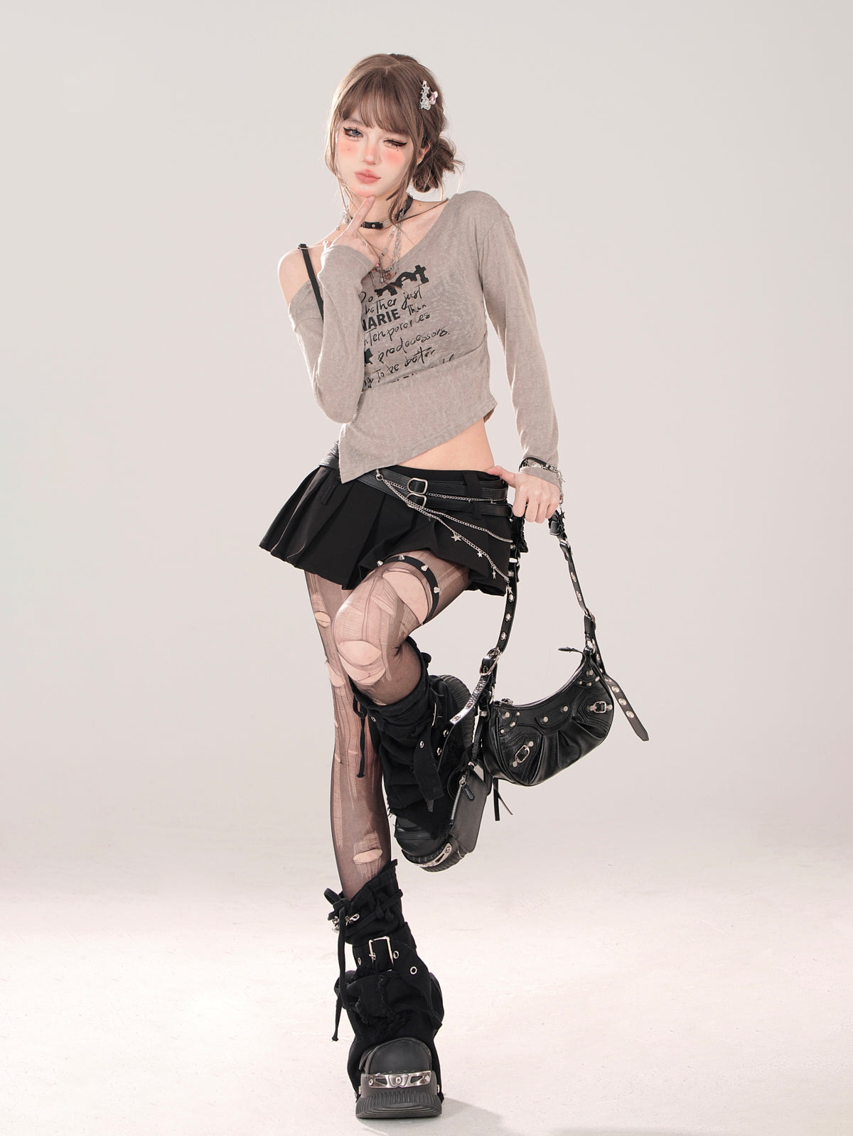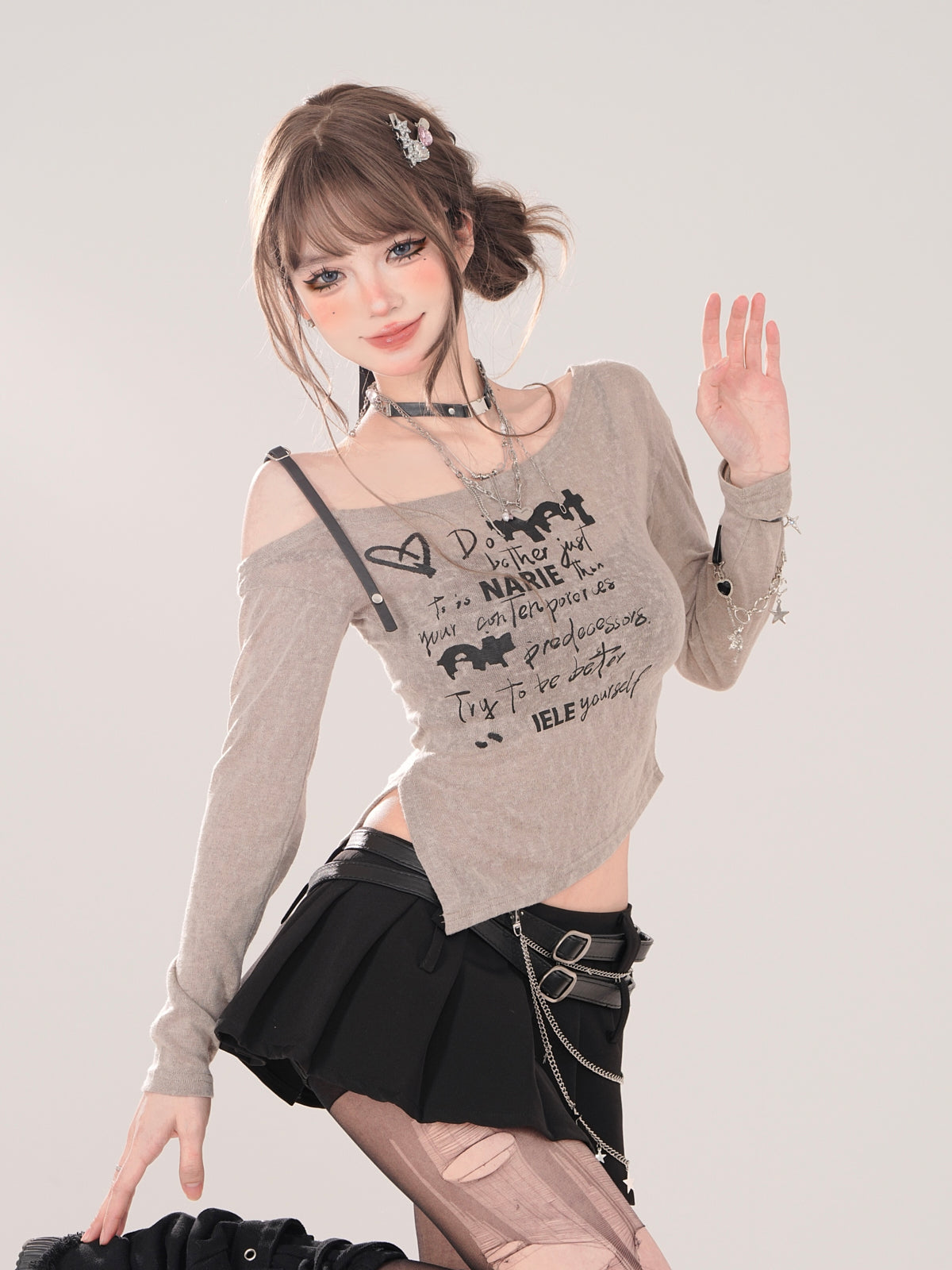 Young Eyes Grunge Typography Black & Gray Slim Fit Off Shoulder Shirt Top