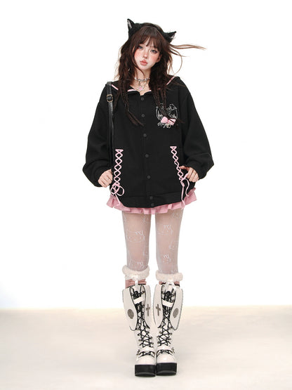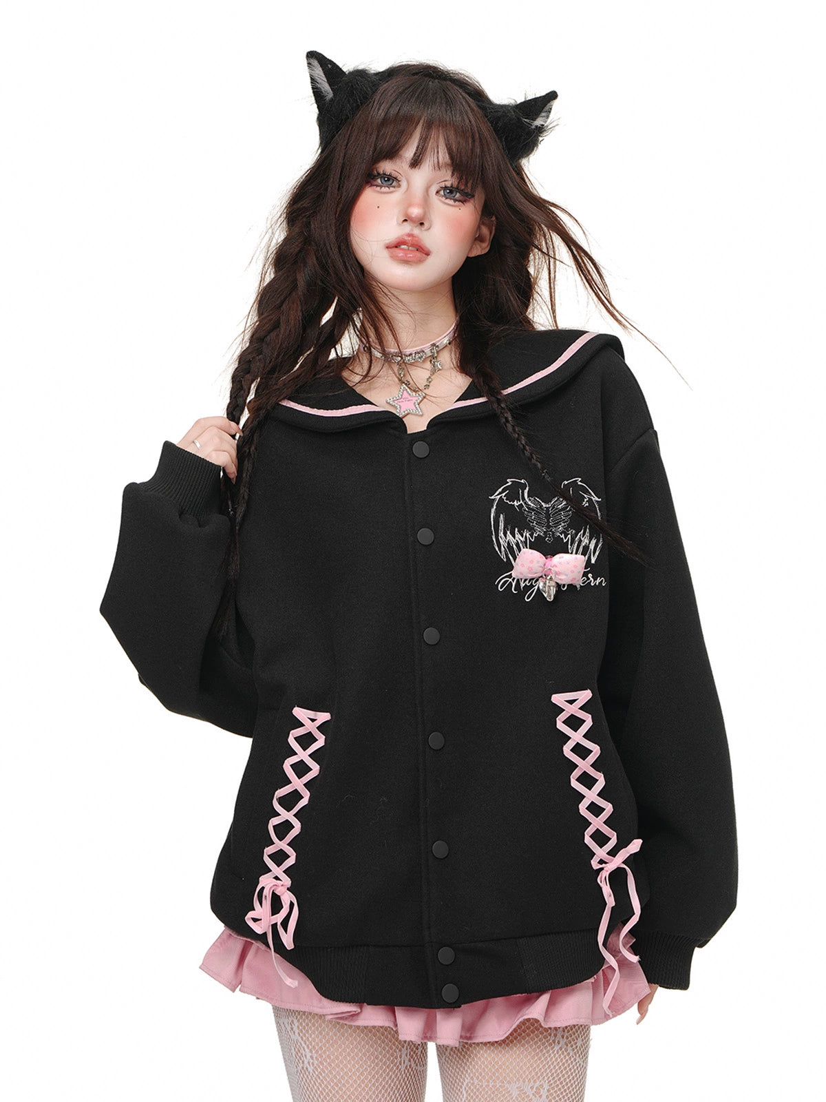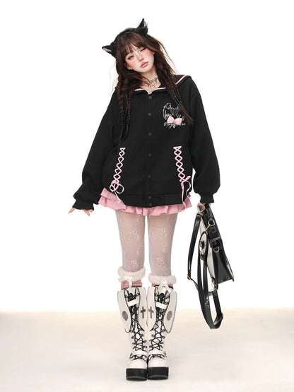 Young Eyes Heart Signal Sailor Collar Black Jacket Sweater