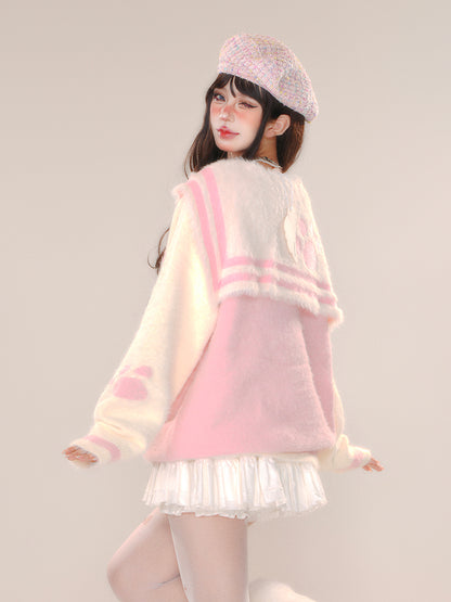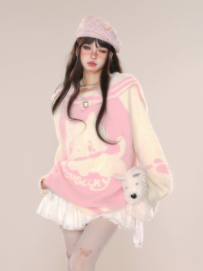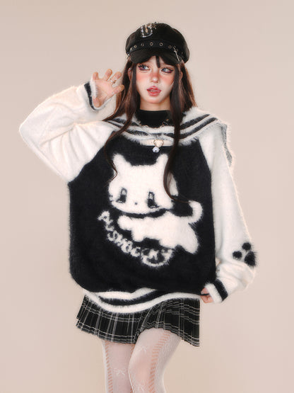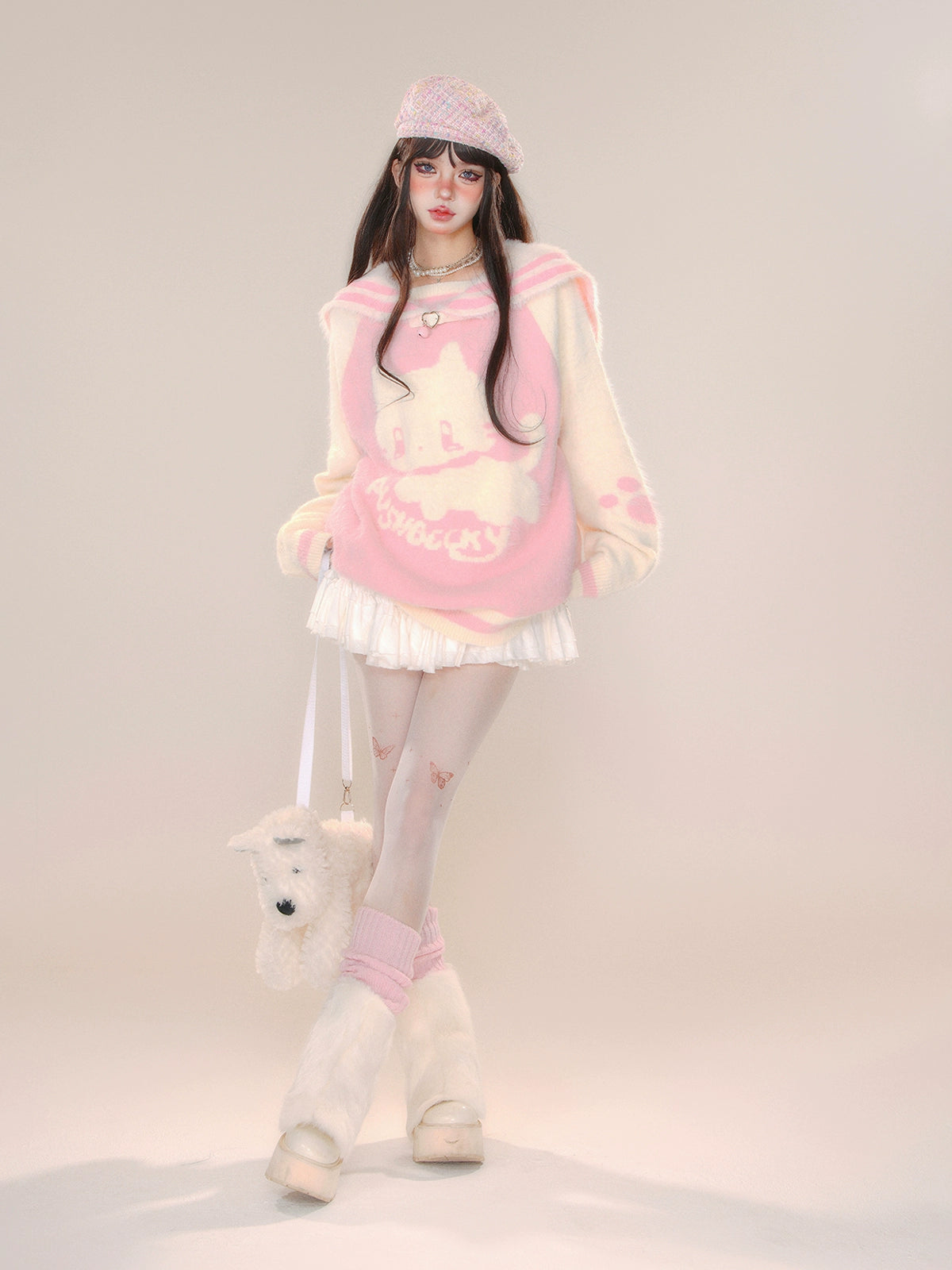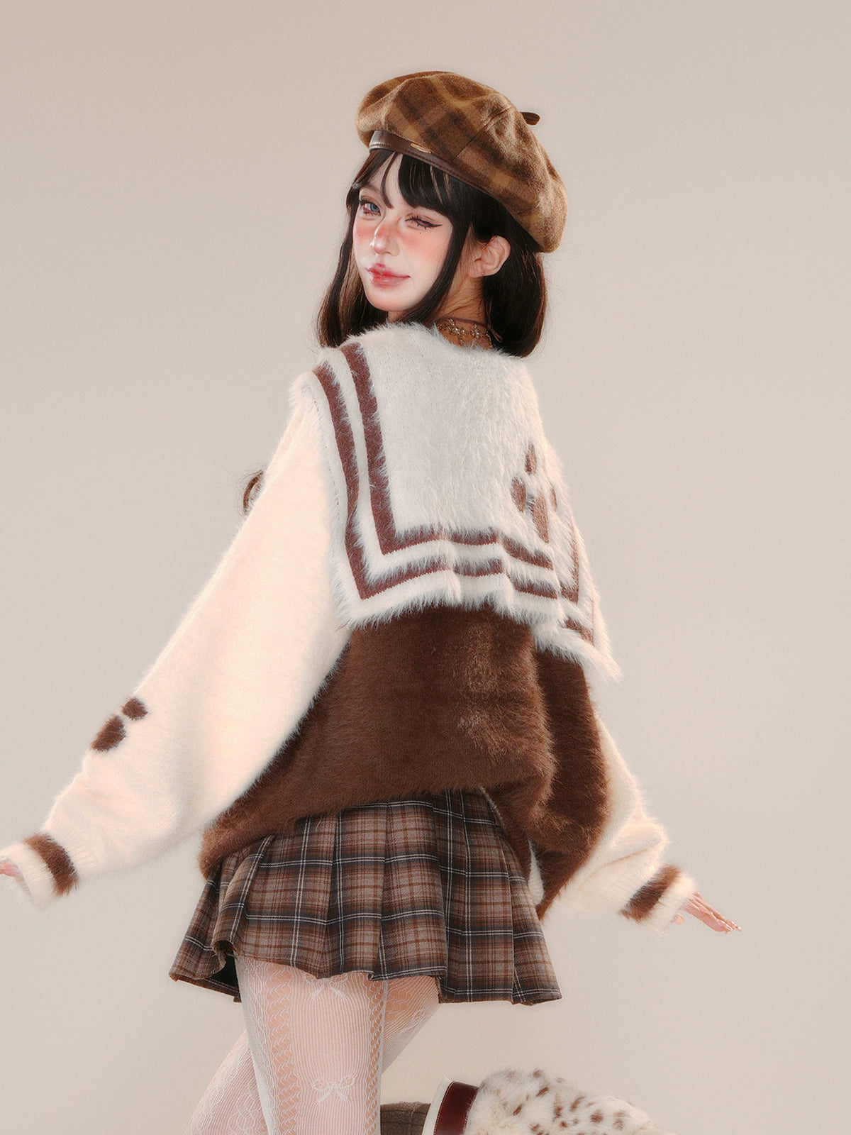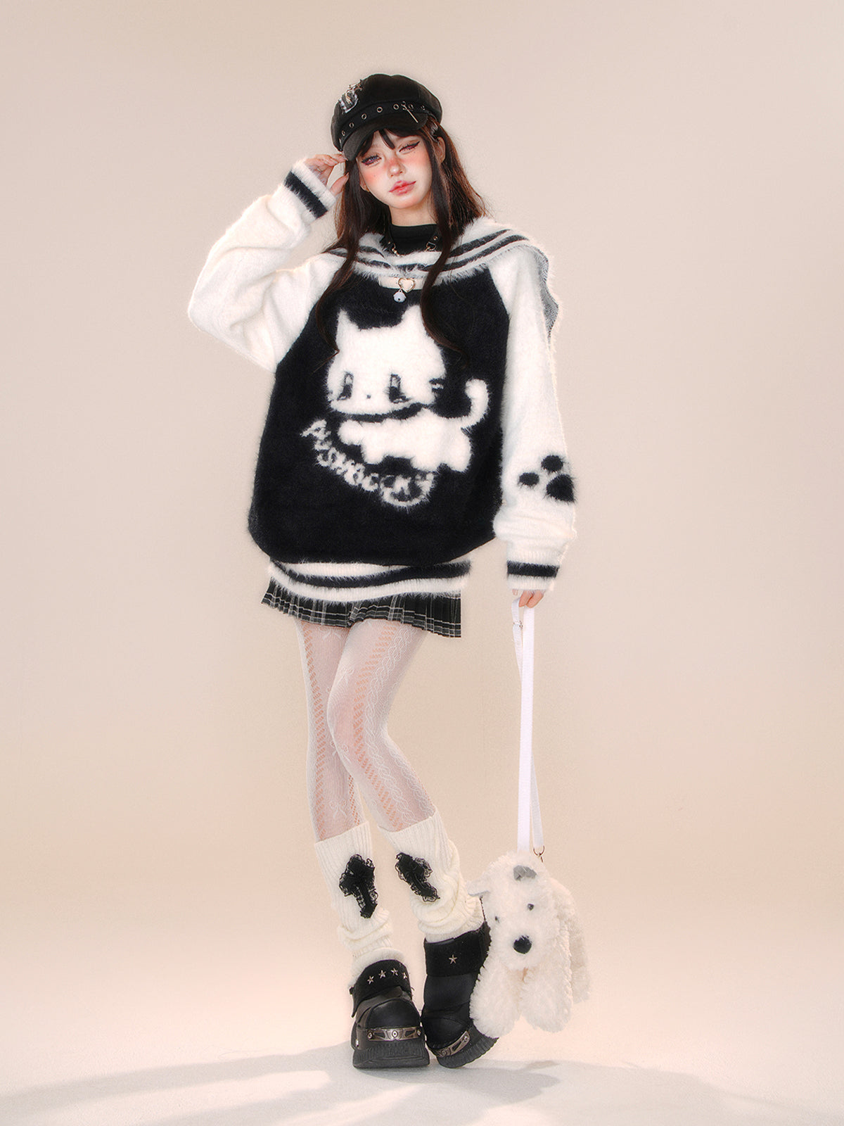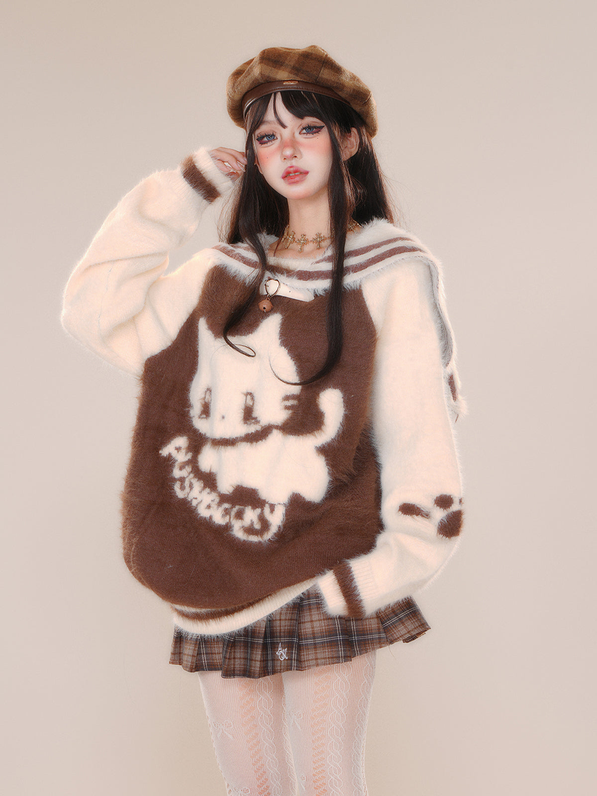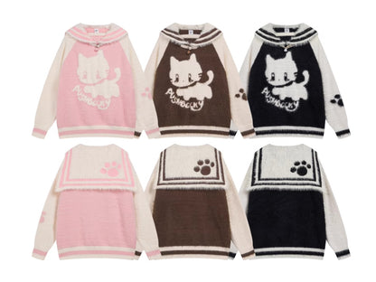 Young Eyes Lazy Cat Sailor Collar Black Brown Pink Fuzzy Sweater