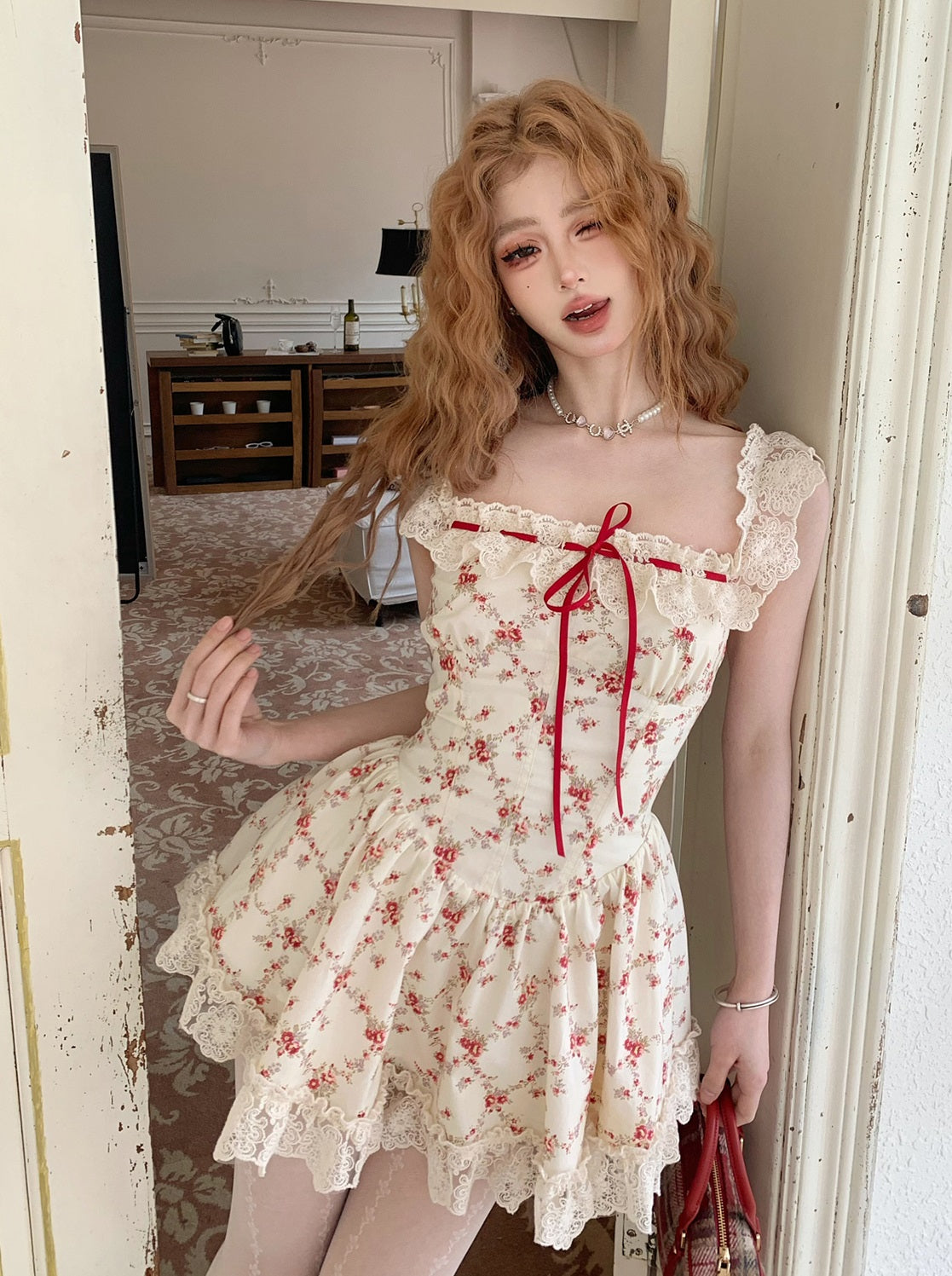 Young Eyes Summer Rose Floral Cream Dress & Red Cardigan Two Piece Set