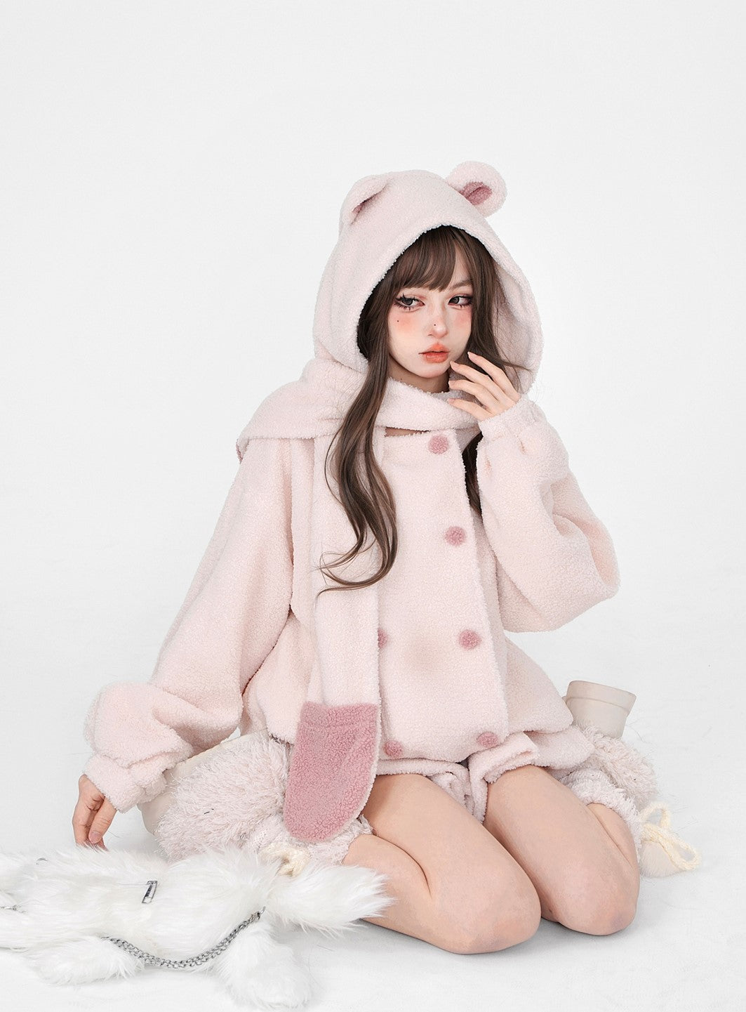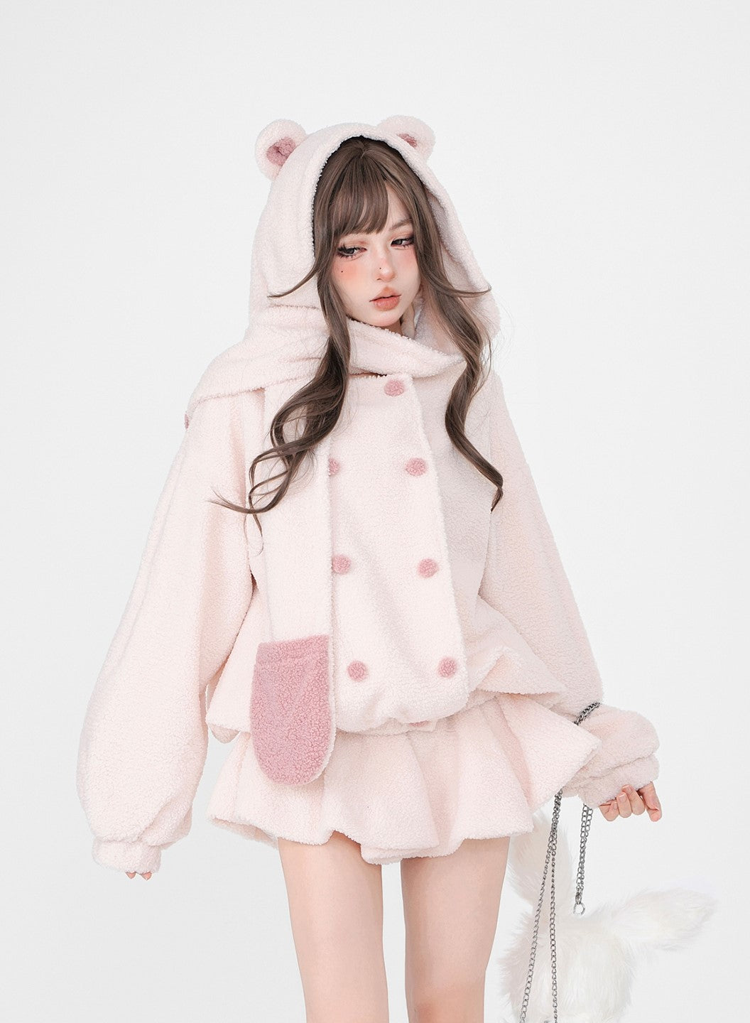 Young Eyes Winter White Soft Pink Plush Fleece Bear Hooded Scarf Jacket & Skirt Two Piece Set