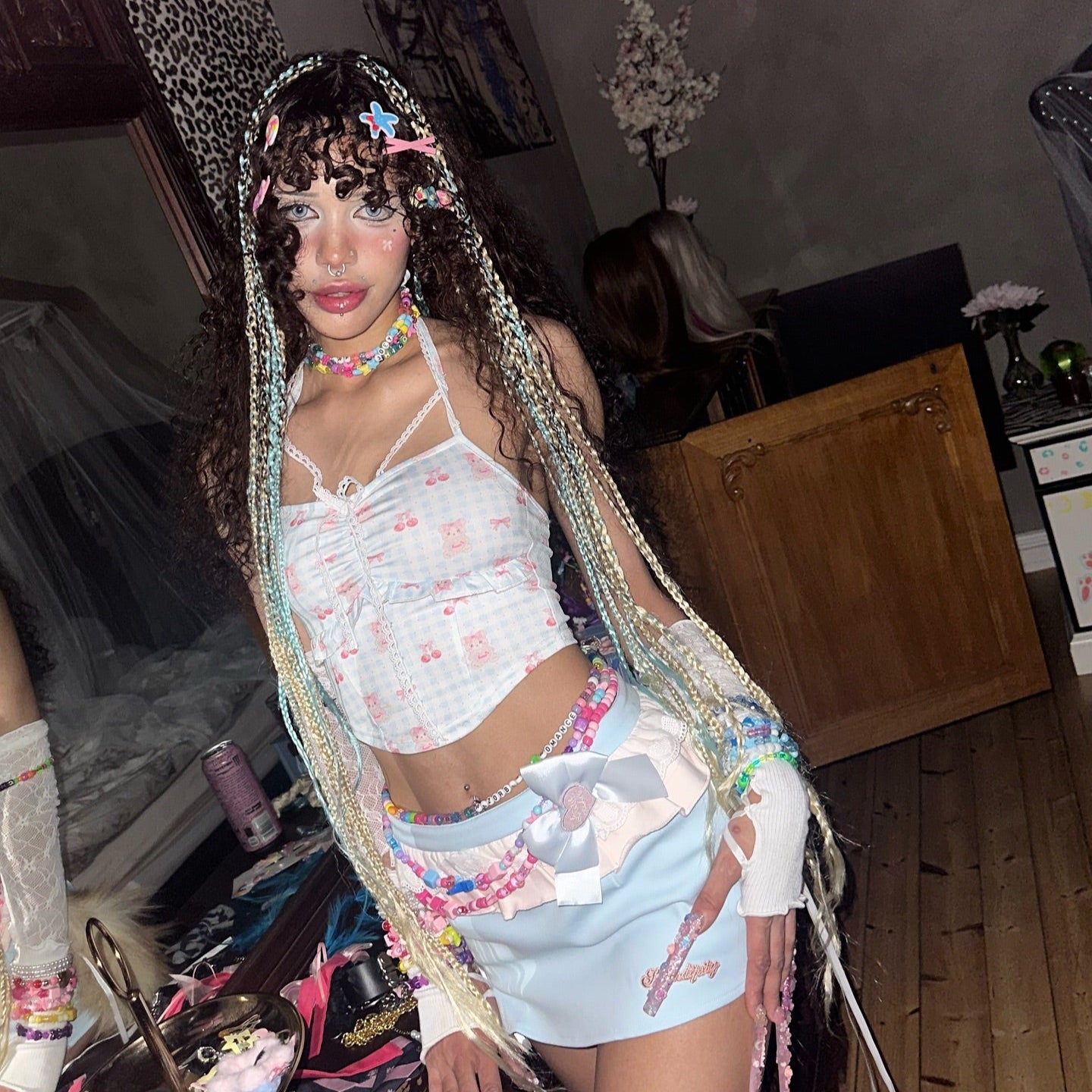 just look at this absolute kawaii masterpiece from @sugarplumstorenvy 🐰☁️wearing their bunny ribbon top and denim mini skirt combo