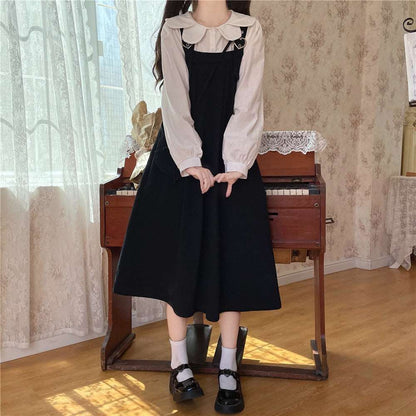 Autumn Mori Girl Heart Navy Blue Black Brown Green Dress Suspender Skirt & White Shirt Blouse Two Piece Set
