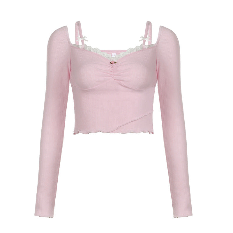 Coquette Pink Rose Lace Bow Square Neck Shirt Top
