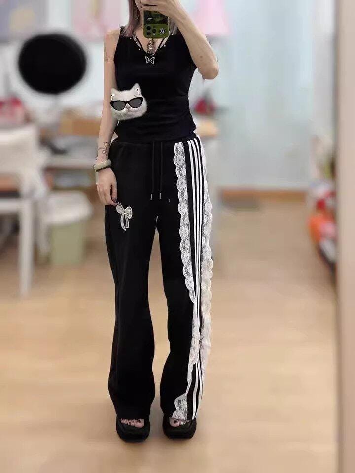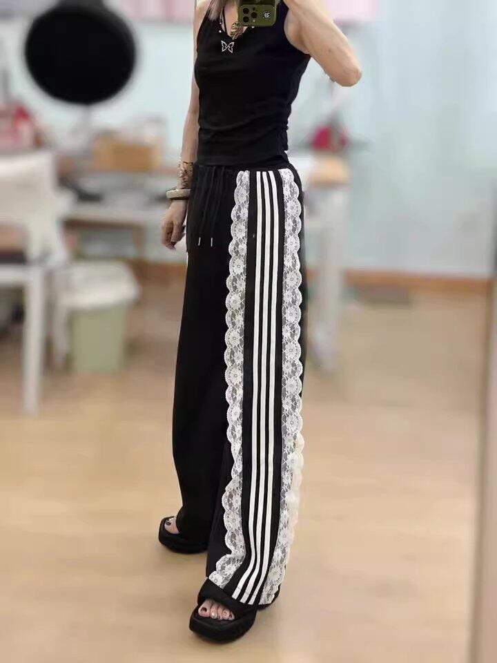 Crazy Girl Lace Navy Blue Red Elastic Waist Sweatpants