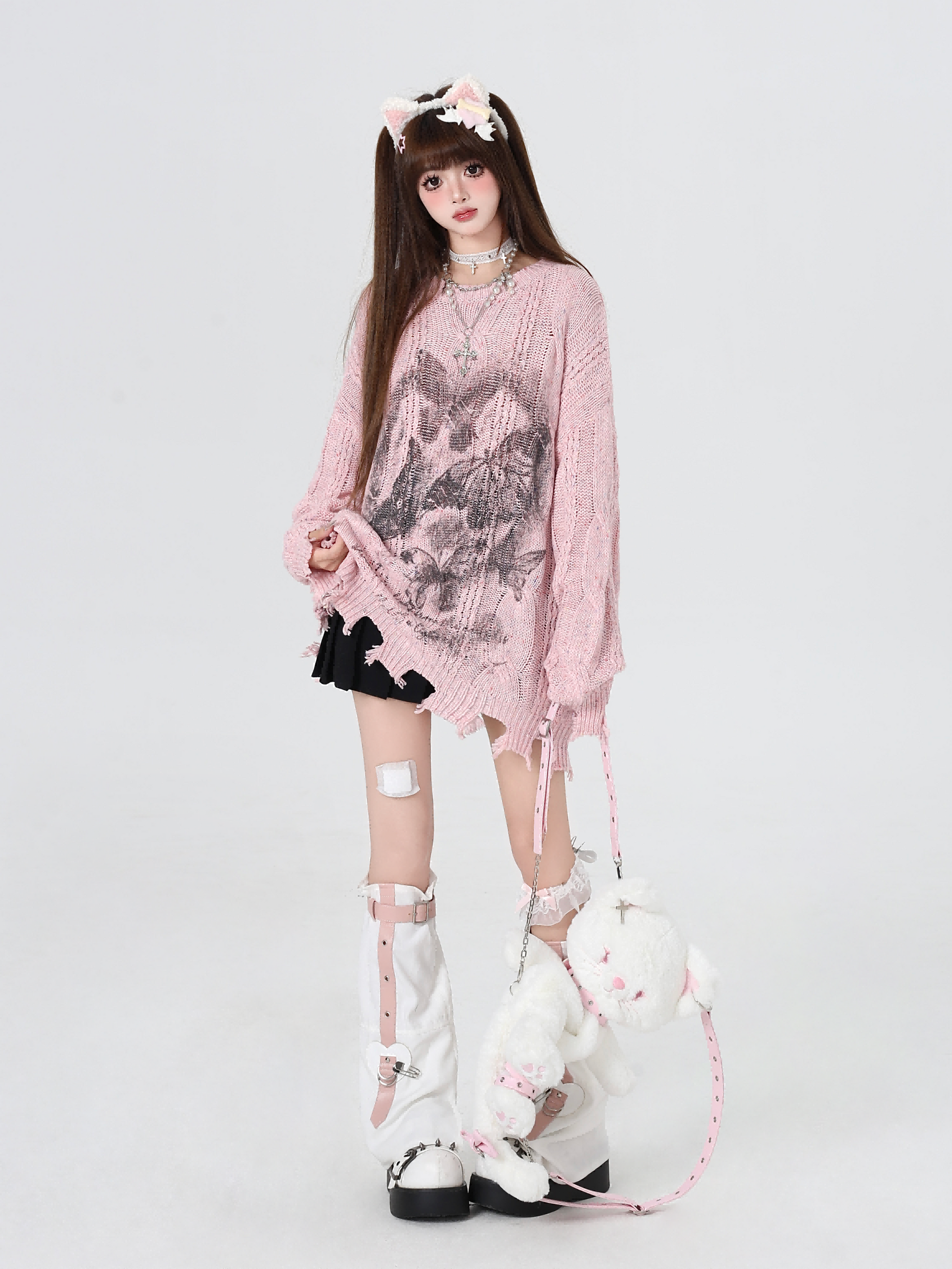 Crazy Girl Retro Wasteland Butterfly Pink White Knit Sweater
