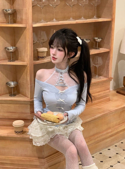 Creamy Cute Blue Spring Top & White Skirt Two Piece Set