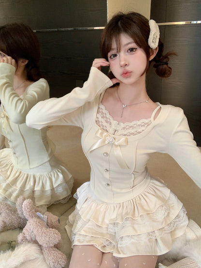 Creamy Cute Coquette White & Pink Lace Shirt Top Ruffled Skirt Two Piece Set