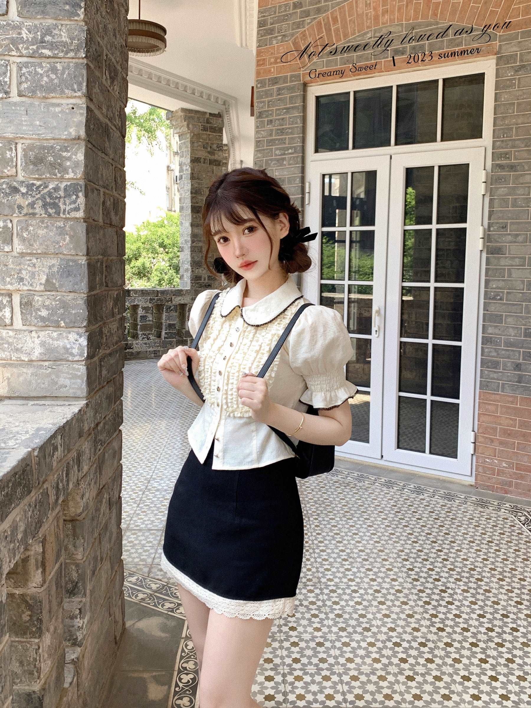 Creamy Cute Doll Collar Lace Cream Blouse Shirt Black Mini Skirt Two Piece Set