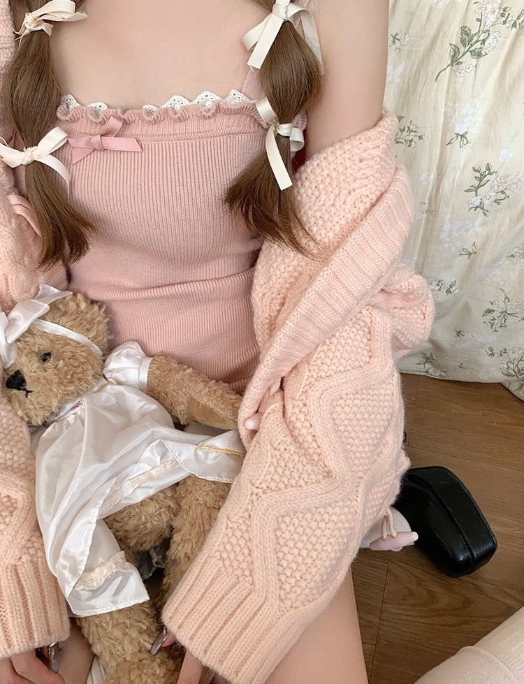 Creamy Cute Soft Girl Pink Knit Long Cardigan & Strap Dress Two Piece Set