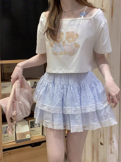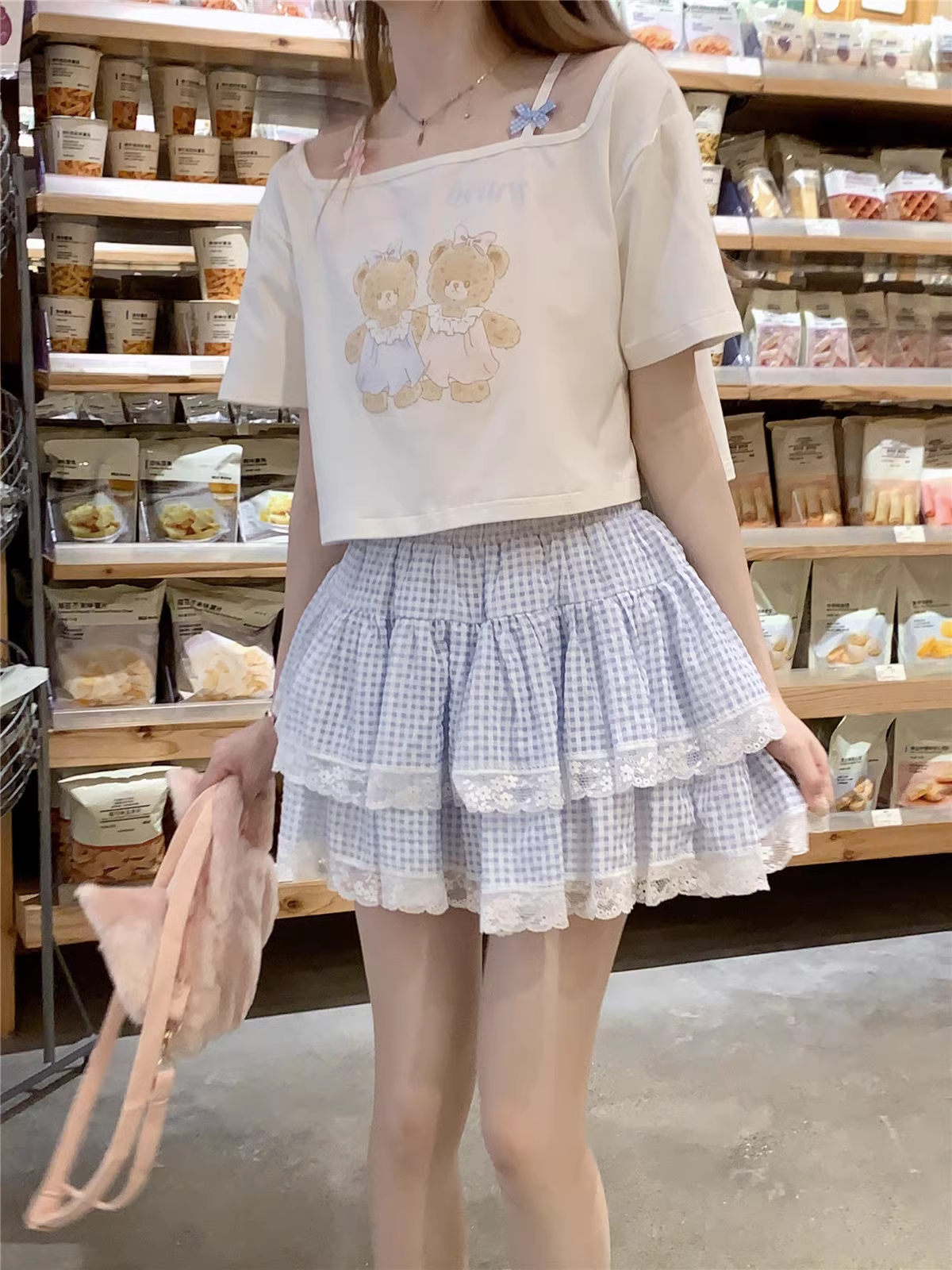 Cute Coquette Girl Black White Blue Plaid Pattern Comfy Mini Short Gathered Skirt