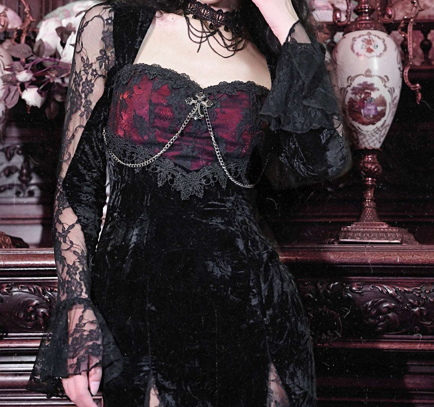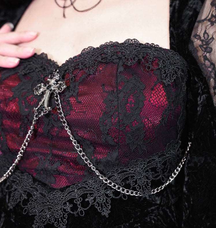 Time to embrace your gothic girl dream! The dress is made of red light fabric, comfortable black pleated velvet fabric, and stitching lace, decorated with a gemstone cross and chain, enhancing your body curve and inner rebellious spirit.