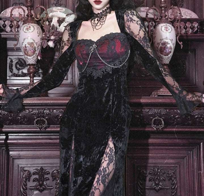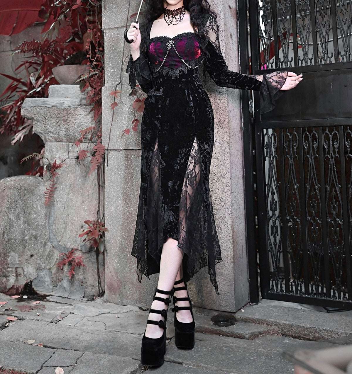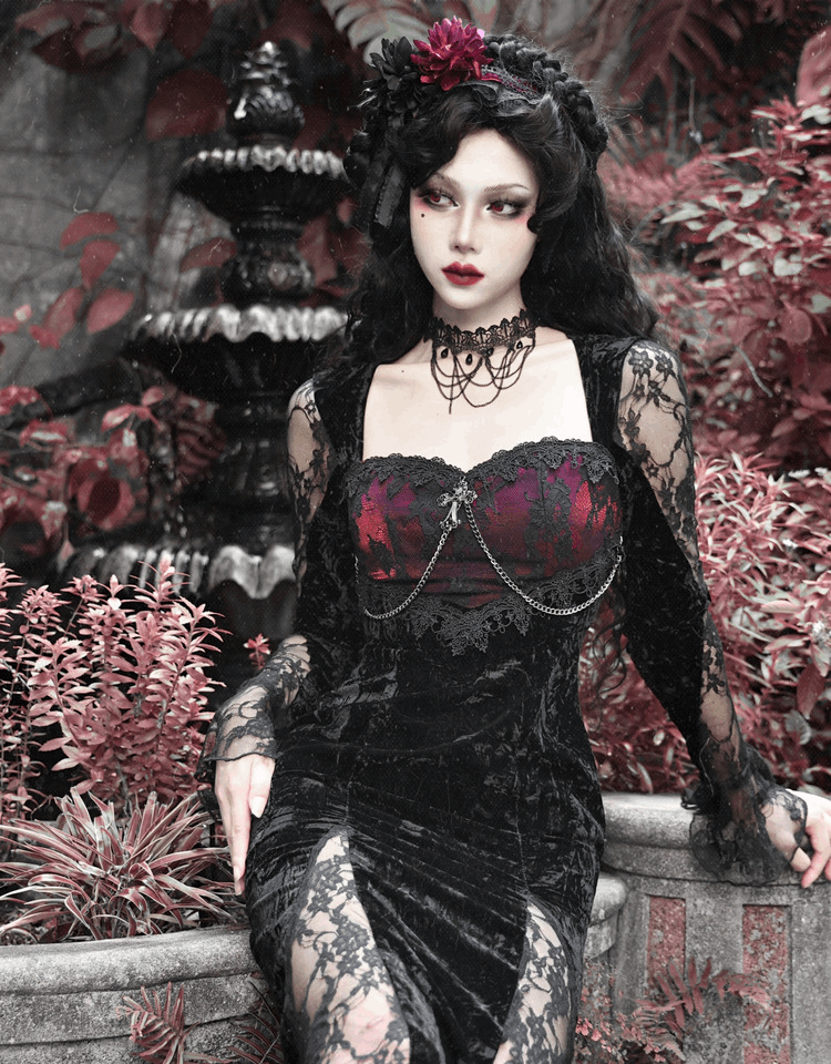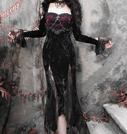 Blood Supply Dark Gothic Dream Rose Stitching Lace Velvet Fishtail Dress
