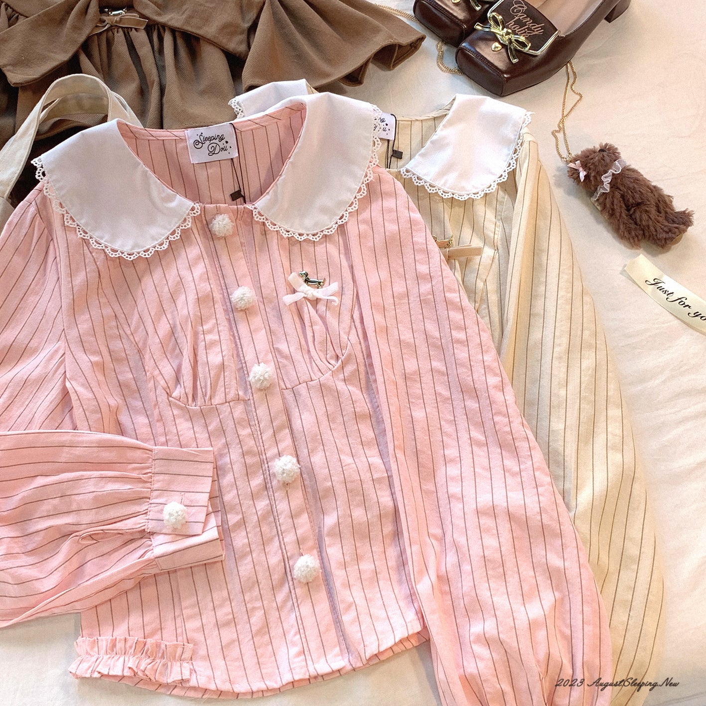 Dormir Doll Dachshund Puppy Bengal Stripe Doll Collar Cream Pink Shirt & Brown Shorts Two Piece Set