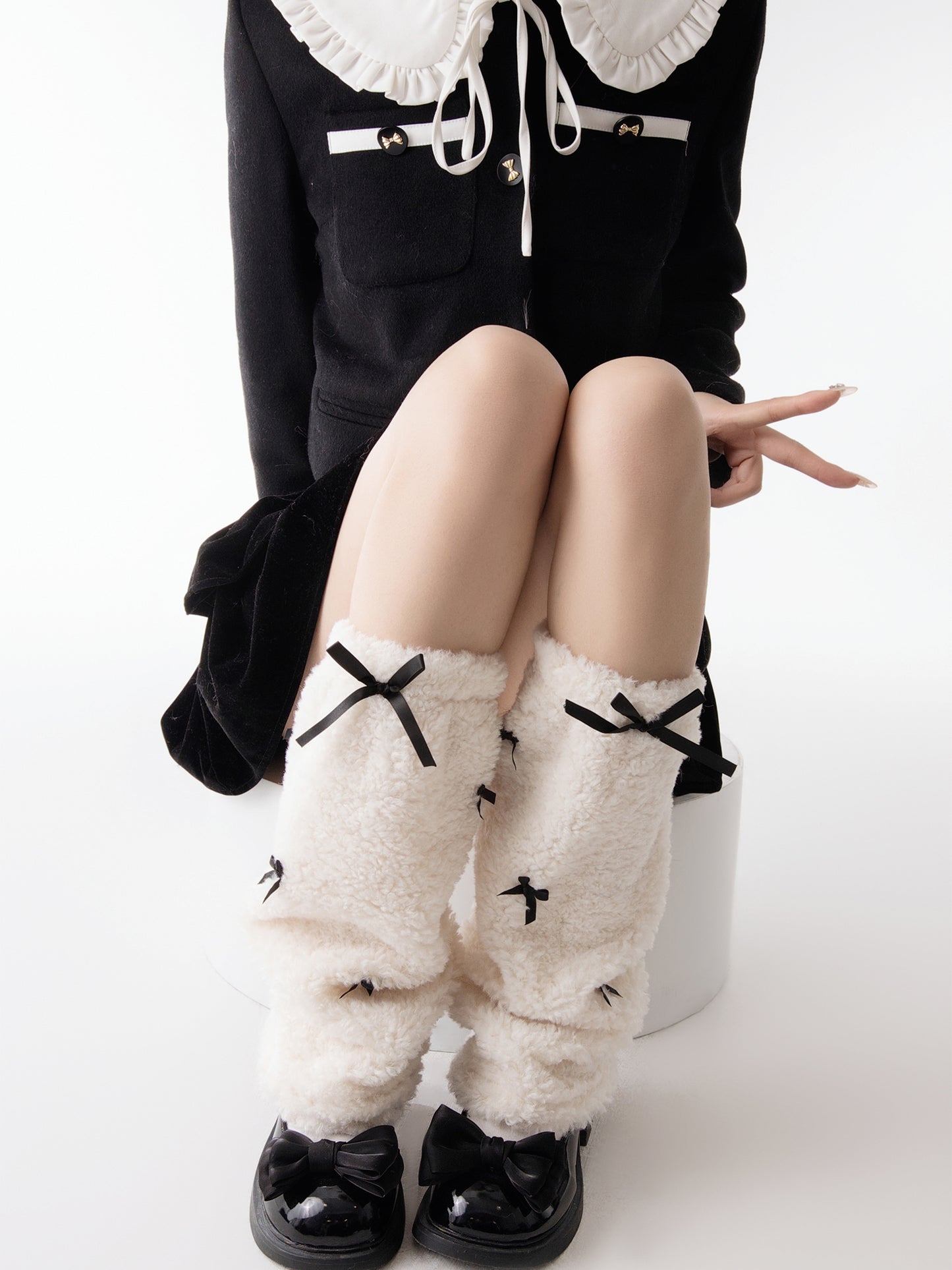 Fluffy Wool Black Bow Coquette White Brown Warm Leg Warmers